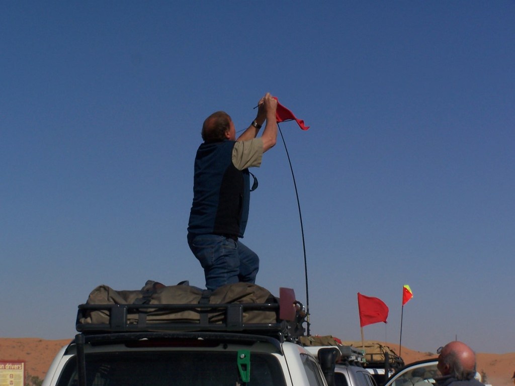 Er wordt lucht uit de banden gelaten, stokken met vlaggen worden aan de auto’s vastgemaakt en er wordt aandachtig geluisterd naar de instructies van onze gids Mike. De komende dagen zullen we over in totaal zo’n 1.200 van deze duinen heen rijden. Ik vind het prachtig, de spanning van het aan de ene kant tegen de duin oprijden, de verwachting van wat je ziet als je er bovenop bent en dan de manoeuvres die uitgevoerd worden om heelhuids weer beneden te komen. Een van mijn medereizigers laat mij in zijn auto rijden. Dus ik mag ook een paar duinen “nemen”. Het gaat gelukkig goed, als is het wel even wennen. En opnieuw passeren we een “drielandenpunt”: