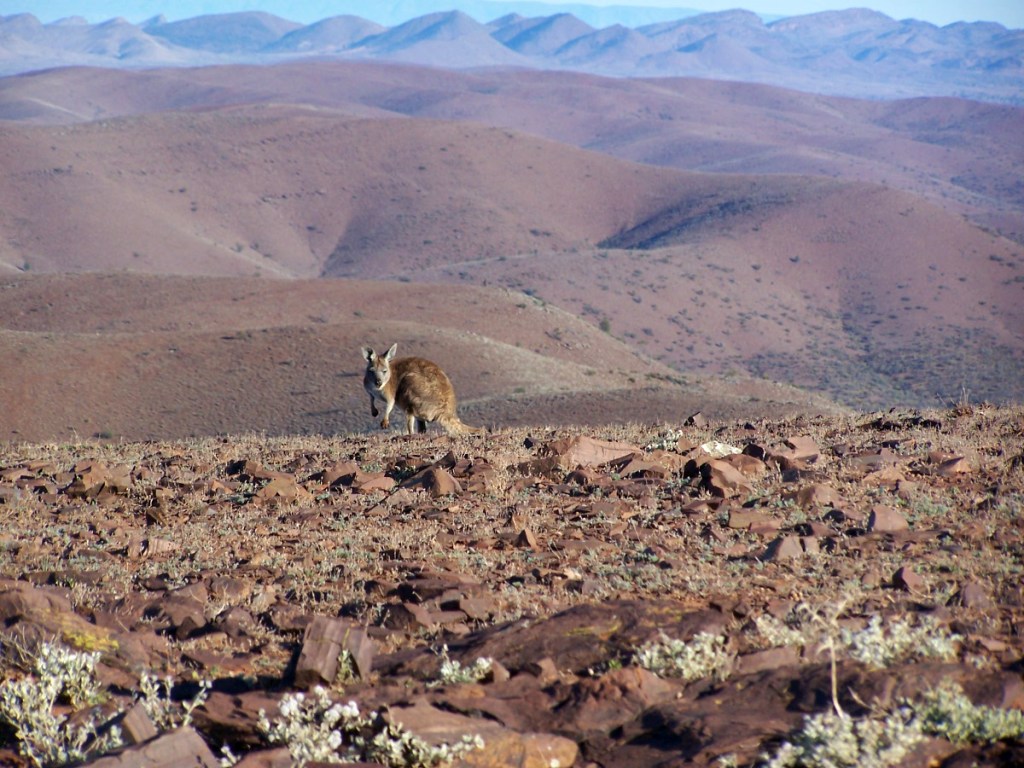 Ook zijn hier veel vogels; als ik ’s ochtends wakker word vliegen er wel vijftig galah’s (een kleine kaketoesoort) boven mijn hoofd. Maar het mooist is toch de wilde dingo die ik spot als ik mijn ochtendwandelingetje maak. Het laatste gedeelte van de desert zie je langzaam de omgeving veranderen. Er komt wat meer begroeiing, de duinen worden lager totdat ze helemaal verdwenen zijn en er verschijnen zogenaamde mesa’s: tafelbergen.