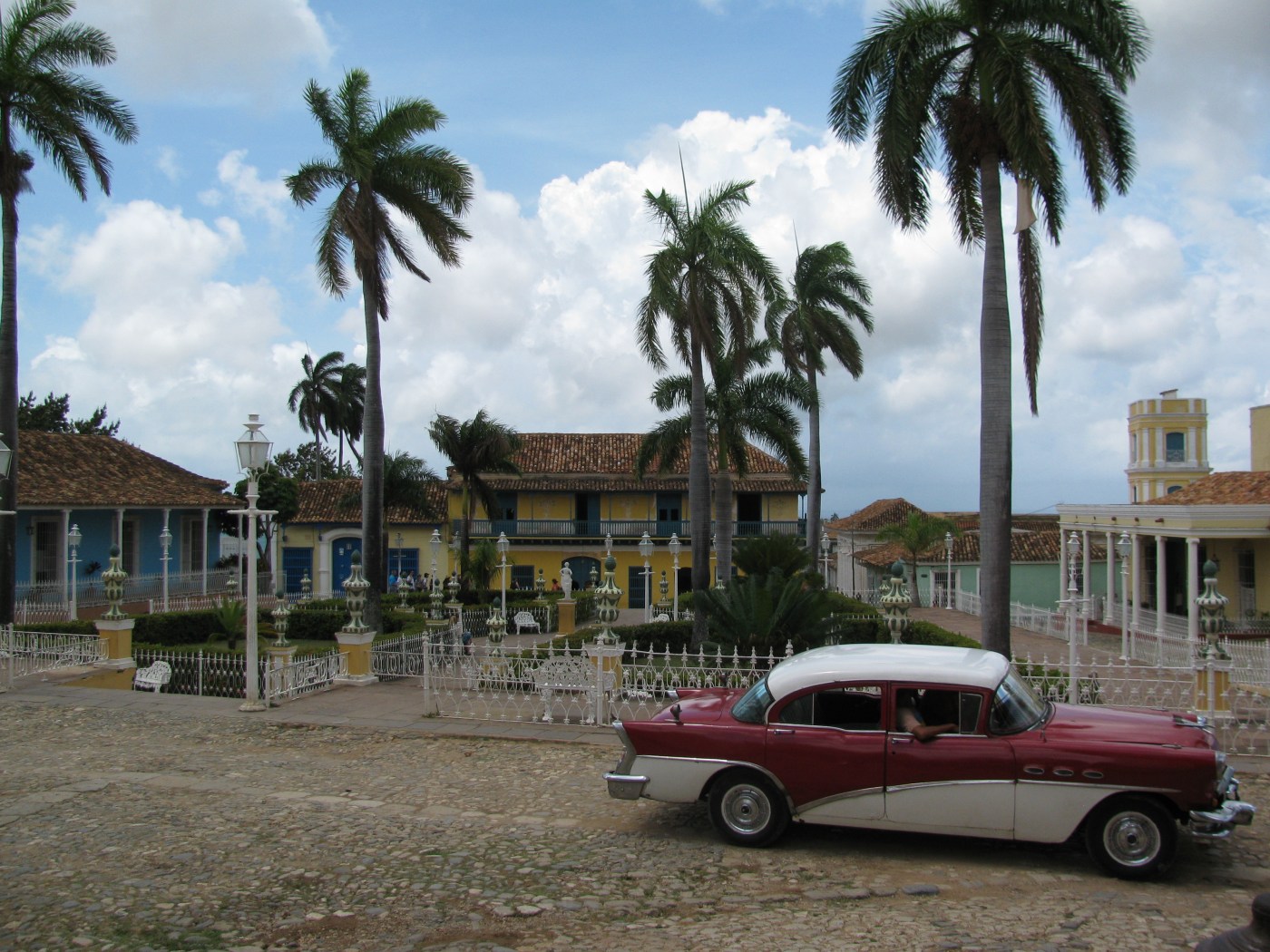 Trinidad is een plaatsje dat de sfeer van Cuba nog het beste weergeeft denk ik. Een klein stadje, hier en daar zelfs gerestaureerd en met een zeer vrolijke, vriendelijke uitstraling. Ook hier weer de parkeerwachter (officieel deze keer, want hij heeft een stokje met een kartonnen bord bij zich waarop “official parking” staat :-). Bij het vervolgen van onze tocht komen we door de Valle de los Ingenios. Hier is duidelijk te zien wat er over is van de eens zo grote suikerrietindustrie: vervallen gebouwen, uitkijktorens van waaruit vroeger werd gewaakt over de arbeiders en verder vooral gras i.p.v. riet). De suikerrietindustrie was een van de belangrijkste bronnen van inkomsten door vooral export naar de Sovjet-Unie. Maar na het uiteenvallen van dat land verdween de steun aan Cuba en verdween deze afzetmarkt.