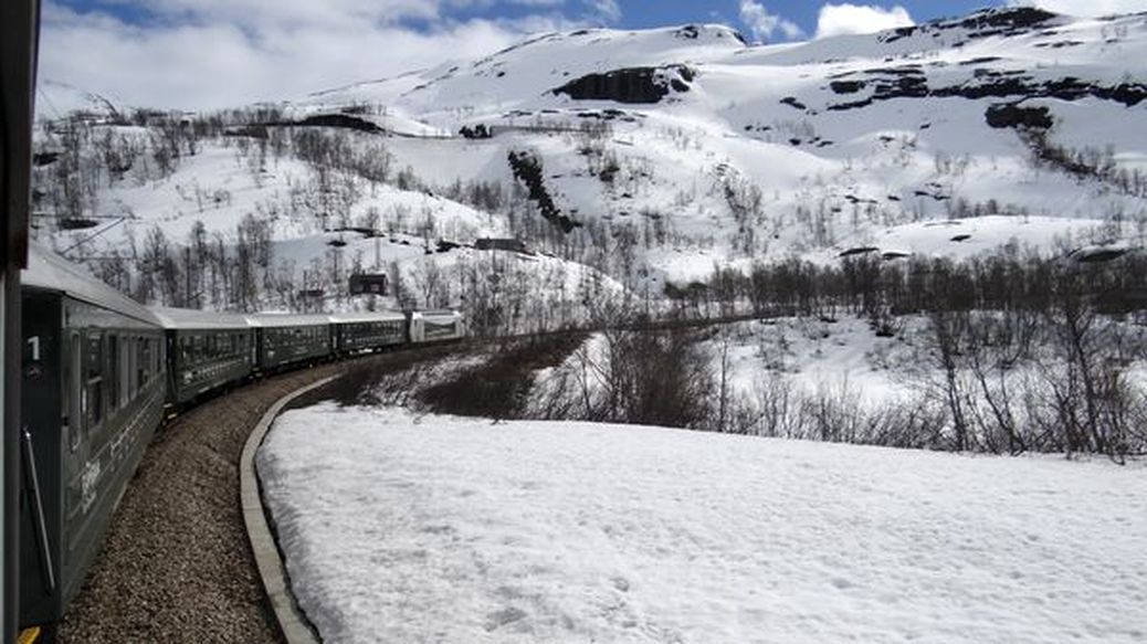 We verlaten de fjorden en reizen met de Flåmsbana terug naar Bergen. Een werkelijk schitterende tocht (Railaway-waardig), hoog door de bergen en we stappen even uit bij de Kjosfossen waterval. Niet ver van deze waterval verlaten we de trein voor een tussenstop in Vatnahalsen. We zijn zo ongeveer de enige gasten in dit hotel. Hier wordt met name in de winter veel geskied en hoewel we volledig omgeven zijn door sneeuw, is het nu klaarblijkelijk geen ski-seizoen.