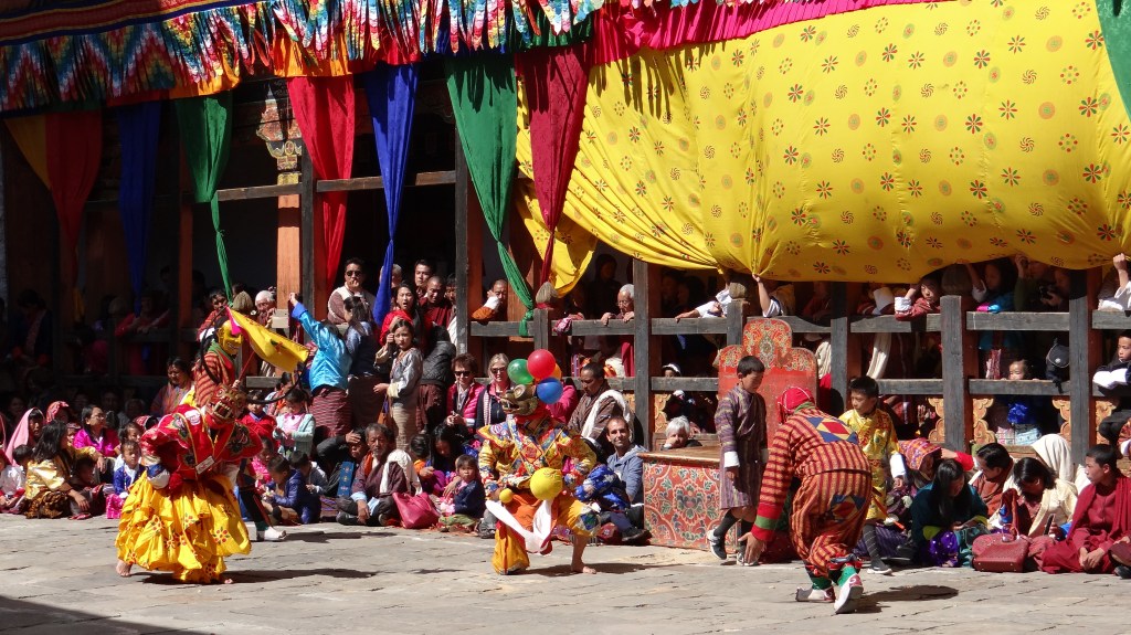 Een hoogtepunt is het festival dat we in de Bumthang-vallei bezoeken. In de dzong/tempel wordt drie dagen gedanst, waarbij de zogenaamde maskerdans het belangrijkste onderdeel is, De dansen zijn allemaal gebaseerd op religieuze thema’s en voor ons leken is het niet altijd even duidelijk waar het om gaat. Maar het is prachtig om te zien en ook is het leuk om te zien hoe de lokale bevolking, mooi uitgedost in hun go’s (mannen) en kira’s (vrouwen) er een gezinsuitje van maken.