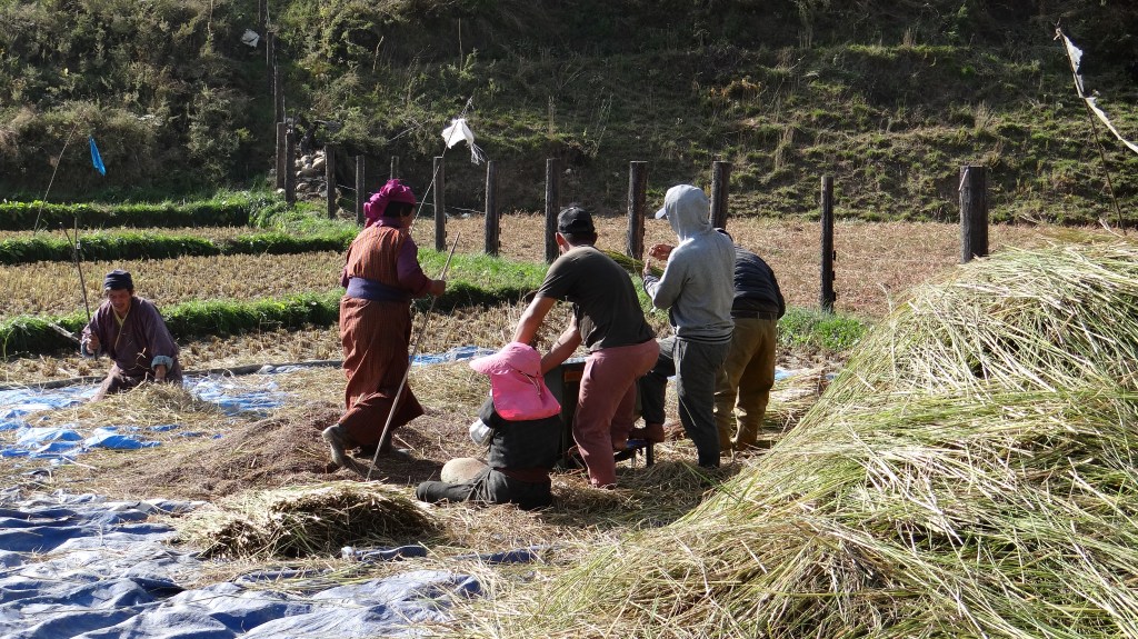 Deze tweede week zijn we meer naar het oosten gereisd. De bergen worden er hoger, de dalen smaller. Veel toeristen gaan maar 5-7 dagen en komen daarom niet zo ver, met als gevolg dat we nu minder toeristen tegenkomen. Het geeft de reis iets extra’s. Het weer is elke dag prachtig en ik geniet dan ook van de mooie uitzichten en de wandelingen die we maken. We zien dan hoe de tijd hier toch voor bepaalde dingen stil heeft gestaan. Zo bekijken we hoe de mensen hier voor het grootste deel met de hand de rijst oogsten en dorsen. Een enkeling heeft het geluk een machine ervoor te hebben kunnen kopen, maar het is veel en hard werken voor de meesten.