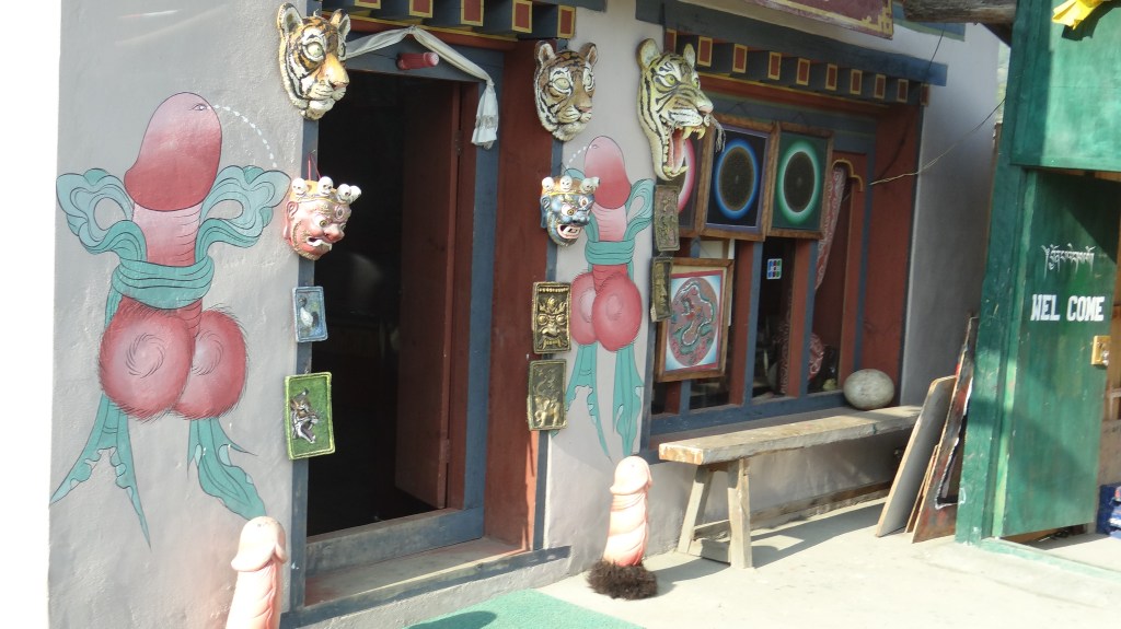Gelukkig is er dan een moment van hilariteit want ja, ik moet het er toch even over hebben, Bhutanezen zijn ervan overtuigd dat het fallus-symbool er voor zorgt dat kwade geesten verdwijnen en dat je gevrijwaard blijft van ongeluk als je dit b.v. op je huis schildert. Dus als we naar de “vruchtbaarheidstempel” gaan, rijden we eerst door een straatje waar je als souvenir de fallussen in alle vormen en maten kunt kopen. Zo komen tradities en geld verdienen aan toeristen dicht bij elkaar.