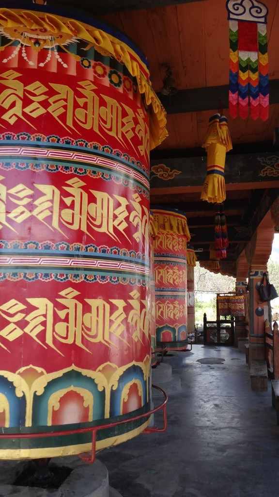 En ja, dan is er ook nog de bijzondere cultuur van Bhutan. Voor het belangrijkste deel is dit ingegeven door het boeddhisme. De meeste mensen zijn erg gelovig en je ziet dan ook overal biddende mensen aan de zogenaamde “prayerwheels” draaien, of zich soms ter aarde werpen om met handen, knieën en hoofd op de grond hun gebed te doen. Dit doen ze dan vooral bij en in de vele tempels die het land rijk is. We bezoeken veel tempels en dzongs, kloosters, chorten, Tibetaanse, Nepalese en Bhutanese stoepa’s (eigenlijk zijn dat ook weer chorten maar we raken de draad soms een beetje kwijt). Onze gids is gelukkig een meester in vertellen over de figuren en gebeurtenissen die met het boeddhisme te maken hebben al haken we zo richting het einde van de reis wel een beetje af, want het is ook zó veel!