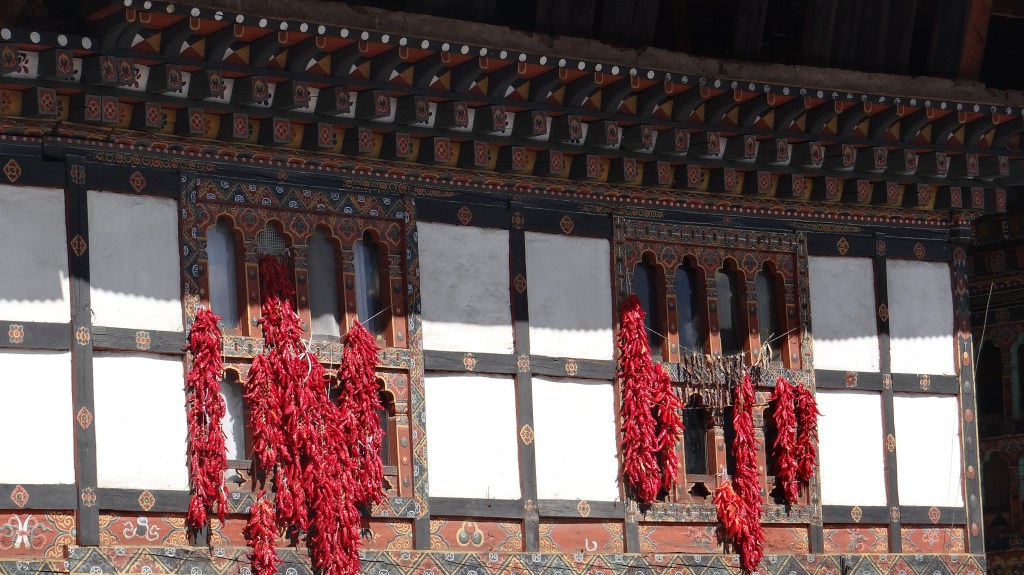 Wat eten betreft is er niet veel variatie. Bhutan gaat er prat op alleen biologische landbouw toe te staan. Er worden geen bestrijdingsmiddelen of onnatuurlijke meststoffen gebruikt. Maar er worden ook niet heel veel verschillende producten verbouwd. Dit vertaalt zich naar vrij eenzijdige maaltijden die we voorgeschoteld krijgen en het fruit is niet altijd even vers. De Bhutanezen zelf zijn gek op chilipepers, die ze dan ook in allerlei vormen en op verschillende manieren klaargemaakt bij hun eten gooien.  Het nationale gerecht is chili & cheese dat bij elke maaltijd wel aanwezig is. Alleen, niet voor ons toeristen. De gids is echter zo vriendelijk om mij telkens iets van de pepers te brengen, want hij heeft door dat ik wel van pittig eten hou. Ze verbouwen de pepers ook en laten daarna drogen. Je ziet dan ook overal daken, bedekt met rode en soms groene pepers. Of er hangen hele strengen pepers aan de muren.