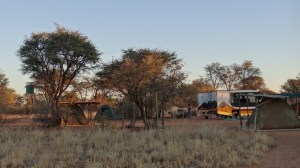En weer zitten we in de Kalahari woestijn maar dan wel in een ander deel. Deze eerste nacht slapen we weer in een bushcamp, vlakbij de Bosjesmannen (de San bushmen). Dit zijn de mensen die als eersten het gebied dat nu Namibië is, bewoonden. We zien een huttendorpje maar al snel blijkt dat ze daar niet meer echt wonen. Er zijn nog maar heel weinig Bosjesmannen die nog op traditionele wijze leven. Het huttendorpje dient alleen als decor voor de demonstratie die we krijgen. De mensen wonen er een stukje vandaan in een golfplaten hutje, een hele “verbetering” dus. En hoewel ze dus niet meer in lemen hutjes wonen, leven ze nog wel van de natuur. Daarom gaan we eerst met ze mee de “bush” in zodat ze ons informatie kunnen geven over de planten en wat ze er mee doen. we krijgen te zien hoe ze jagen en we krijgen een lesje spoorzoeken. Daarna wordt er voor ons gedanst en gezongen. Een heel interessant en vermakelijk uurtje met een groep lieve, aardige mensen waarmee we via een tolk kunnen communiceren.