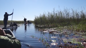 We verruilen Namibië voor Botswana want daar bezoeken we de Okavango delta. Dit waterrijke gebied staat nu als eerstvolgende op het programma. De delta is de grootste binnenlandse delta ter wereld en een Unesco werelderfgoed. Het is weer een hele reis om op onze camping te komen, want na een zeer lange reis met gedeeltelijk heel slechte wegen, worden we weer, inclusief bagage, tenten, kookgerei en voorraden “overgeladen” op een 4×4 in het dorpje Etsha. Vervolgens hobbelen we nog drie kwartier over een terrein zonder dat we een weg zien en gelukkig hebben we een lokale chauffeur die weet waar hij naar toe moet. We zetten in het donker onze tenten op en pas de volgende ochtend zie ik dat we op een prachtige plek zijn aangeland. Onze camping ligt aan het water waar we later op de dag in een boot stappen, die ons verder de delta in brengt. Na een half uur stappen we over op zogenaamde mokoro’s, boomstambootjes. Alleen worden deze bootjes tegenwoordig niet meer van boomstammen gemaakt maar van glasvezel om het milieu te sparen.
