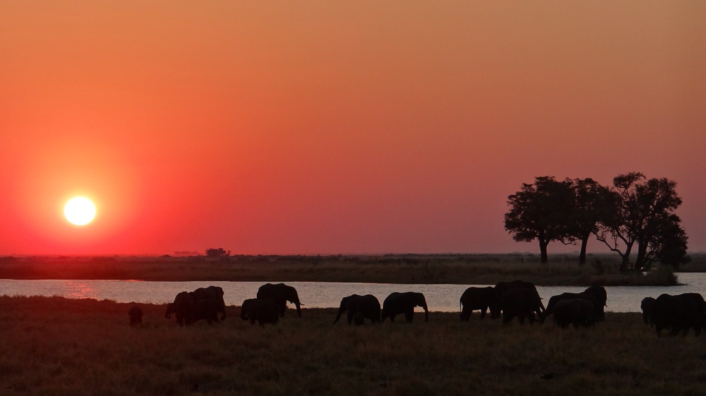 In Botswana wemelt het van de olifanten en dat blijkt ook wel als we in het Chobe National Park een game cruise maken over een rivier. “Game” betekent tegenwoordig “wilde dieren”, maar eigenlijk staat het voor de jacht op wilde dieren voor sport of voor voedsel. Dus gaan wij op jacht naar de olifanten. Die zijn hier volop aanwezig. We zien diverse kuddes en ook meerdere mannetjes die alleen rondwerven. Maar Chobe biedt veel meer dan alleen olifanten. Er liggen hier krokodillen en nijlpaarden in het water, er lopen giraffen rond, maraboes vliegen af en aan en we eindigen met de mooiste zonsondergang die ik ooit heb gezien. Dat we midden tussen de wilde dieren zitten wordt op de camping wel duidelijk. Naast het geritsel van bladeren en het geluid van vogels hoor je hier ook de wrattenzwijnen luid knorrend naar voedsel zoeken, nijlpaarden in de verte luid grommen, olifanten trompetteren, vindt een bosbok haar weg naar ons eten en als klap op de vuurpijl vertelt de assistent-gids die met ons mee is deze tour, dat hij ‘s nachts bij een toiletbezoek een luipaard zag lopen. Ik moet er echt niet aan denken dat mij dit zou kunnen gebeuren.