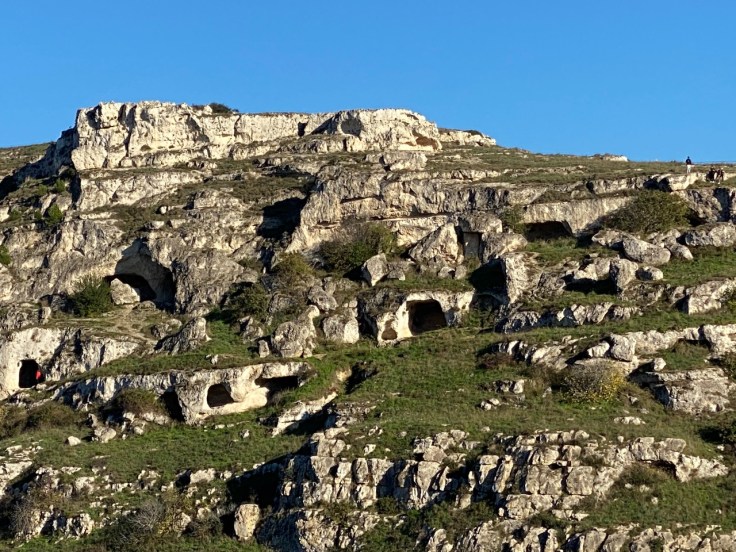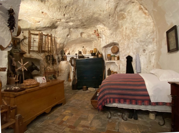 Na een week wordt het tijd om weer verder te trekken. Daarom boek ik een overtocht naar Sicilië en vertrek vandaag richting Villa San Giovanni waar de veerboot vertrekt. Ik doe het echter rustig aan en rij niet in één keer naar de haven. Dat geeft me de mogelijkheid om Matera te bezoeken en daar te overnachten. Matera ligt een stukje uit de kust aan de rand van een kloof. Aan beide zijden van deze kloof zijn grotwoningen te vinden. Al in de bronstijd leefden hier mensen in primitieve grotten. In de loop der eeuwen werden de grotten steeds professioneler uitgehakt en ingericht. Ook werd het uitgehakte puin gebruikt om façades te maken zodat de voorkant steeds meer op huizen ging lijken. Er zijn in het uitgestrekte gebied zo’n 150 kerken te vinden. Soms niet groter dan een woonkamer, soms met de omvang van een kathedraal. Al deze fasen zijn nu nog te bewonderen en maken een bijzondere stad van Matera. Een van deze grotten is als museum ingericht en daarin zie je een ruimte met apart keukentje en een stal voor de dieren. Toch is de ruimte niet heel groot en moest men er met 11 personen in leven. In de jaren 50 van de vorige eeuw besloot de overheid om de grotwoningen te ontruimen vanwege de slechte leefomstandigheden voor de bewoners. Zij werden ondergebracht in nieuwe moderne wijken, In 1968 vertrok de laatste bewoner en de Sassi, zoals de grotwoningen genoemd worden, zijn nu werelderfgoed en daarmee beschermd gebied geworden.