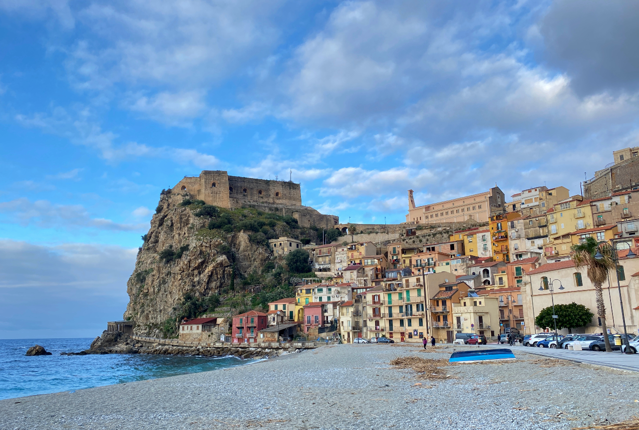 Ken je die mop van de boot die uit Salerno zou vertrekken? Nou die vertrok niet. Had ik al extra tijd in en bij Palermo omdat ik pas een plekje op de boot had voor 2 januari, krijg ik de avond ervoor een berichtje dat de trip geannuleerd is. De eerstvolgende gelegenheid is 7 januari en of ik maar wil aangeven of ik daarvan gebruik wil maken. En nog een paar andere alternatieven. Helaas kreeg ik op mijn mailtjes en telefoontjes geen enkele reactie meer, dus heb ik zelf maar besloten om mijn ticket te annuleren en niet van Palermo naar Salerno te varen wat het oorspronkelijke idee was. In plaats daarvan ben ik vandaag langs de noordkust van Sicilië terug naar Messina gereden en heb dezelfde veerboot weer genomen, waarmee ik ook op Sicilië ben aangekomen. Een prima weg langs en door soms behoorlijk hoge bergen. Ik denk dat ik door wel 50 korte en langere tunnels ben gereden. En dat is op zich goed te doen, maar het lijkt wel of men op Sicilië geen prijs stelt op veel licht, want ze zijn bijna allemaal zeer spaarzaam verlicht. Veel met groot licht rijden dus en dan kom je er wel. Vanaf de veerboot moet ik nu richting Salerno, of eigenlijk Pompei zien te komen want dat is mijn volgende reisdoel. Dat is nu nog zo’n 450 km. Eens kijken hoever ik morgen kom. Ik ben echter nu neergestreken in Scilla, een postzegeldorpje met een enorm kasteel en leuk strand. Er is geen camping/camperplaats in de buurt, dus ja, toch maar weer gewoon ergens gaan staan..Maar ik ben ook hier niet de enige. Inmiddels staan we met zijn vieren.
