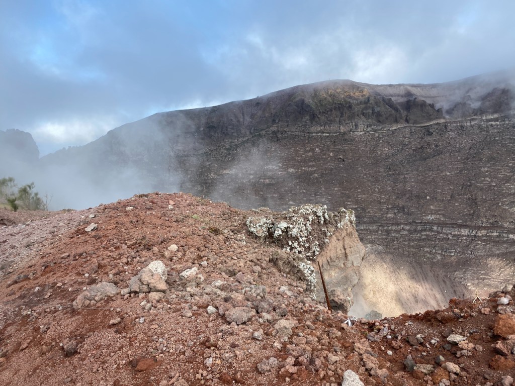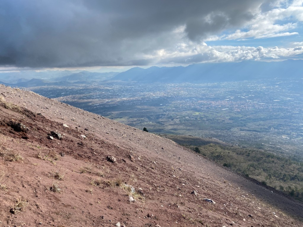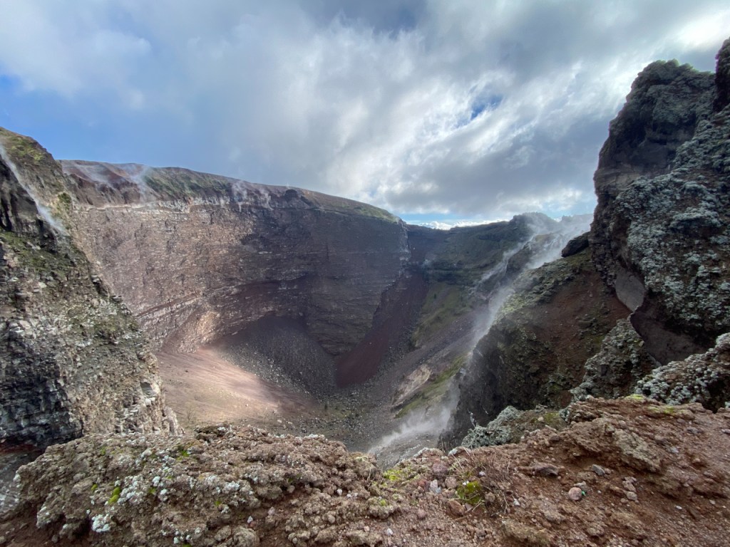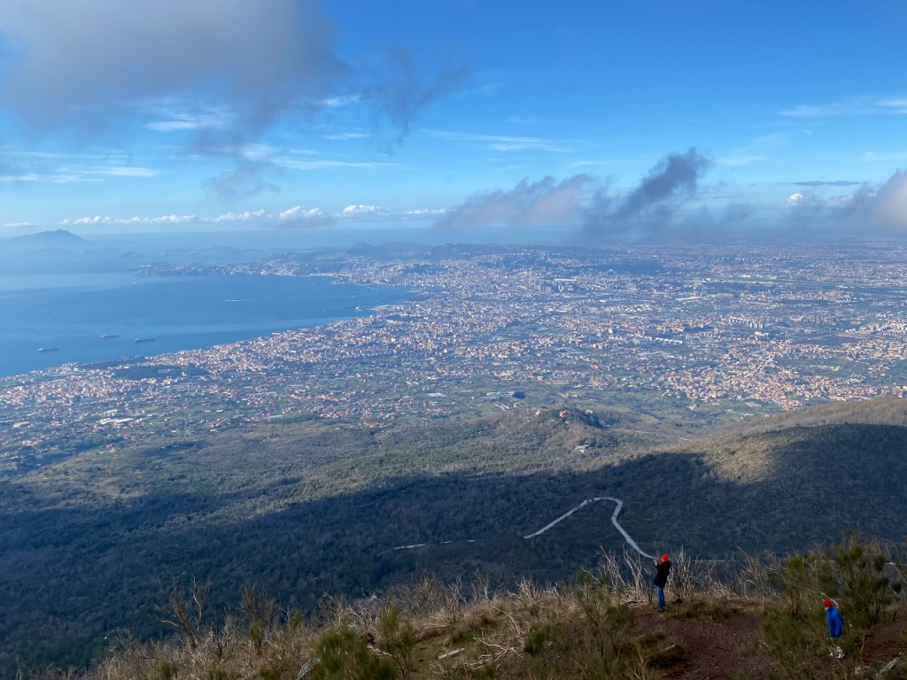 Natuurlijk grijp ik de kans om ook de “boosdoener” van dit alles, de Vesuvius, te bezoeken. Na een ritje met een lokale bus kom ik aan bij een parkeerterrein. Daar blijkt dat je vooraf een ticket online had moeten kopen. Slecht voorbereid dus en ik moet een stukje terug lopen om een internetsignaal op te kunnen vangen om alsnog mijn ticket te kopen. Na het tonen van de QR-code (hier Green Pass genoemd) en mijn zojuist verworven ticket kan ik het nationale park in. En dan sta ik na een pittige klim aan de rand van de krater, waar de dampen nog uit omhoog kringelen. Je ruikt vaag de rotte eierenlucht die altijd bij vulkanische activiteit aanwezig is. Het is prachtig weer en je kunt heel mooi uitkijken over de baai van Napels. Ik geniet van een broodje terwijl ik in de verte Napels zie liggen en Capri, het eiland dat bekend is als toeristische bestemming maar ook de naamgever is voor o.a. de insalata caprese en pizza caprese. Zeer voldaan van al dit moois sjok ik de berg weer af. En, naar beneden is zwaarder dan naar boven want er liggen nogal wat losse stenen, waar je voortdurend op uitglijdt. Maar het is de moeite allemaal zeker waard. Ik heb genoten van deze prachtige tocht.