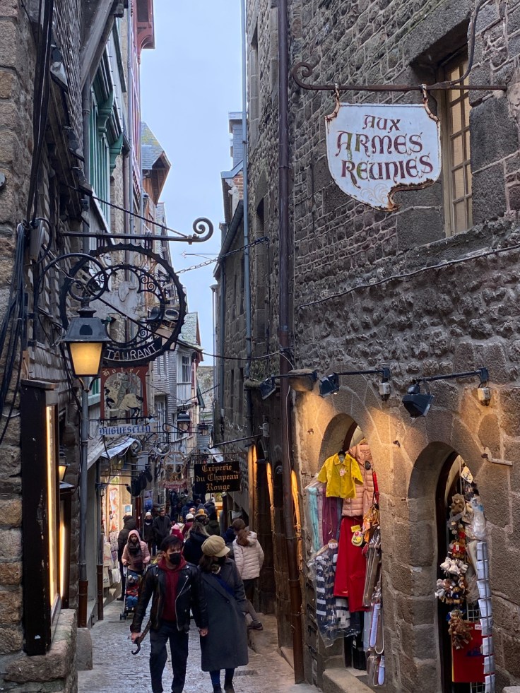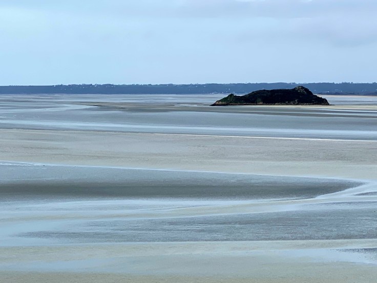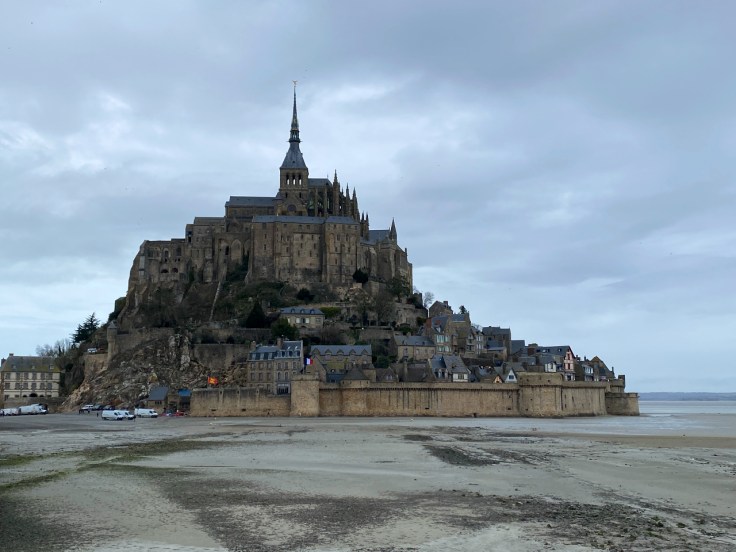 Zo bijna aan het einde van mijn roadtrip ben ik eindelijk in de gelegenheid om de Mont Saint Michel eens te bezoeken. Ooit heb ik het in de verte wel eens zien liggen, maar een daadwerkelijk bezoek is er nooit van gekomen.Het rotseiland op de grens tussen Bretagne en Normandië behoort tot de top 3 attracties van Frankrijk (samen met de Eiffeltoren en Versailles). Dat betekent zo’n 3-3,5 miljoen bezoekers per jaar! En dat op een eilandje dat niet groter is dan ongeveer 4 km2 met een handjevol inwoners (voornamelijk monniken in het klooster). Als je bedenkt dat de meeste toeristen er in de zomer zullen zijn, dan kun je je misschien wel voorstellen wat voor een mierenhoop zich door die ene nauwe straat zal bewegen. Maar gelukkig ben ik er in februari met ook nog eens niet heel geweldig weer dus ik hoef me niet in de mensenmassa te storten. Het eiland wordt gedomineerd door een gigantisch complex dat in de vroege middeleeuwen begon als een abdij waaraan later meerdere gebouwen zijn toegevoegd. De legende wil dat een monnik deze abdij wilde bouwen nadat hij een boodschap kreeg van de aartsengel Michael. Al snel wisten pelgrims de weg naar de abdij te vinden en het is nu nog steeds een belangrijk pelgrimsoord. Weliswaar met een onderbreking want voor, tijdens en na de Franse Revolutie was er een gevangenis gevestigd. Een soort Alcatraz dus, want in die tijd was het vrijwel onmogelijk om het vasteland te bereiken zonder boot. Ik heb heel erg genoten van de prachtige middeleeuwse architectuur. Door de steile rotsachtige ondergrond is alles op meerdere niveaus gebouwd, dus er zijn veel trappen en doorkijkjes. En hoeveel veel ook hier gerestaureerd is, ademt alles nog echt de sfeer van de tijd dat de monniken hier hun intrek namen. En er dus ook nog steeds wonen! Het enige wat ik jammer vind aan dit bezoek is dat het eb is en ik dus niet kan genieten van de rots, die uit het water oprijst. Het levert wel weer een mooi plaatje op van mensen die aan het “wad”lopen zijn.