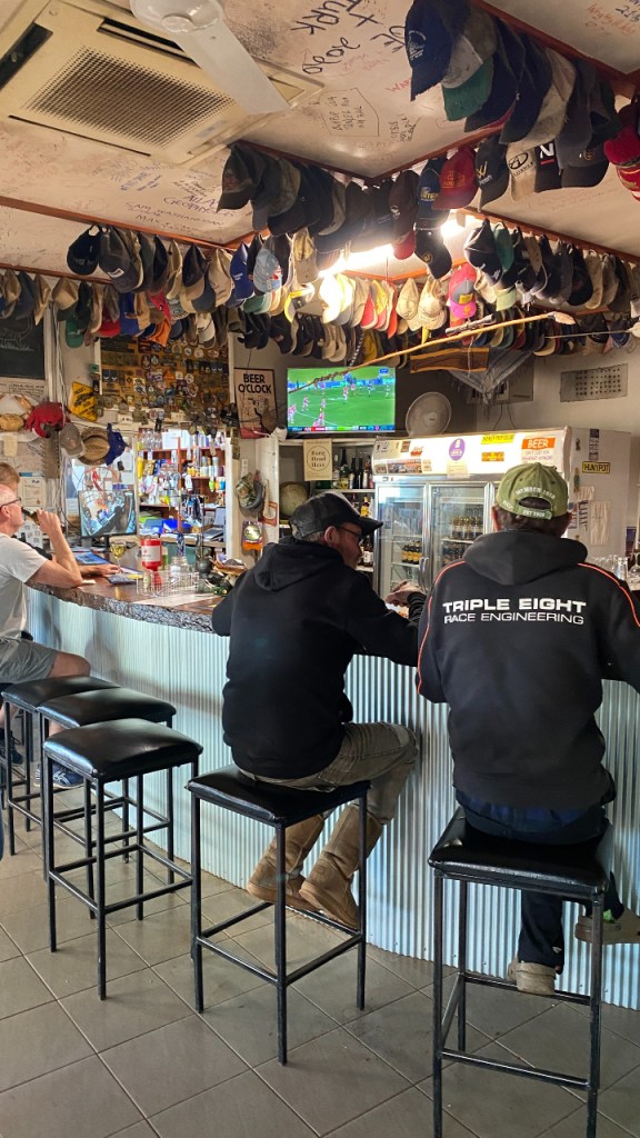 En dan is het niet ver meer naar Renner Springs, waar ik nu voor de derde keer ben. Het valt me mee. Ze hebben duidelijk een upgrade gehad, al is dat zo te zien ook al weer even geleden. De winkel en de bar zijn echter nog steeds hetzelfde. De sfeer is zoals ik het prettig vind. Ik weet niet waarom, maar ik voel me hier thuis. Het is een komen en gaan van toeristen en vooral grote vrachtwagens en road trains. En deze keer is het vrijwel insectenloos. Dat was de vorige keren wel anders met al het rondkruipende en vooral rondvliegende spul. Daar zal de temperatuur wel debet aan zijn, want het is nog steeds veel te koud voor de tijd van het jaar.