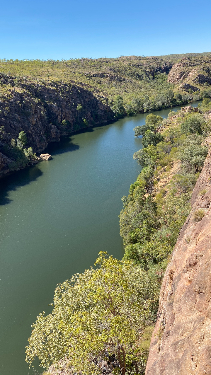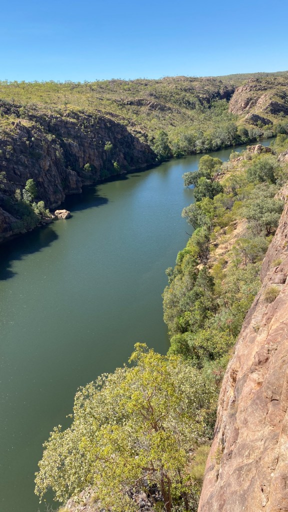 Katherine is vooral bekend vanwege Nitmiluk, ofwel Katherine Gorge. Een gebied niet ver van de stad met dertien kloven, die allemaal in elkaar overlopen. De eerste drie kun je met een boot bevaren, maar helaas zijn alle cruises uitverkocht. Dus ga ik maar wandelen. Vanaf een uitzichtpunt zie je nog een deel van de eerste kloof en verder wandel je in de prachtige natuur. En het is er niet druk want iedereen stapt in de boot dus ik geniet van de omgeving en de stilte.