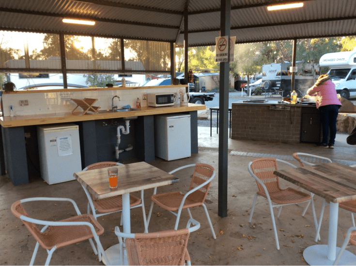 De rest van deze middag relax ik op de camping, in de “camp kitchen”. Bijna elke camping hier heeft wel zoiets. Het is een plek waar je kunt koken, afwassen, barbecueën natuurlijk (wat is een Australiër zonder “barbie”). Maar ook lekker zitten en nog even genieten van de dag.