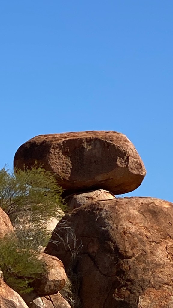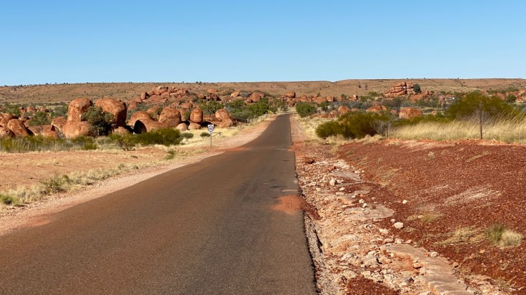 Van Tennant Creek naar Alice Springs moet ik ruim 500 km rijden (GPS zegt over 501 km rechtsaf). Ik zit om 9.00 uur achter het stuur. Dat is geloof ik wel een record. Na ongeveer een uur rijden kom ik bij de Devils Marbles, een natuurverschijnsel in de vorm van grote keien, die her en daar verspreid en gestapeld gestrooid lijken te zijn. Verder stop ik vooral bij roadhouses (de ene nog mooier beschilderd dan de andere) voor koffie, benzine etc. En na een best lange reisdag kom ik aan in Alice Springs en na opnieuw een ijskoude nacht ga ik eerst op zoek naar een deken. En bij de Kmart vind ik die. Een mooie, niet al te dikke, maar wel lekkere warme deken, die ook nog eens niet zo heel duur is. Dat moet in ieder geval beter gaan ’s nachts.