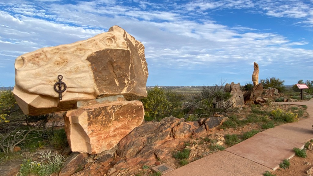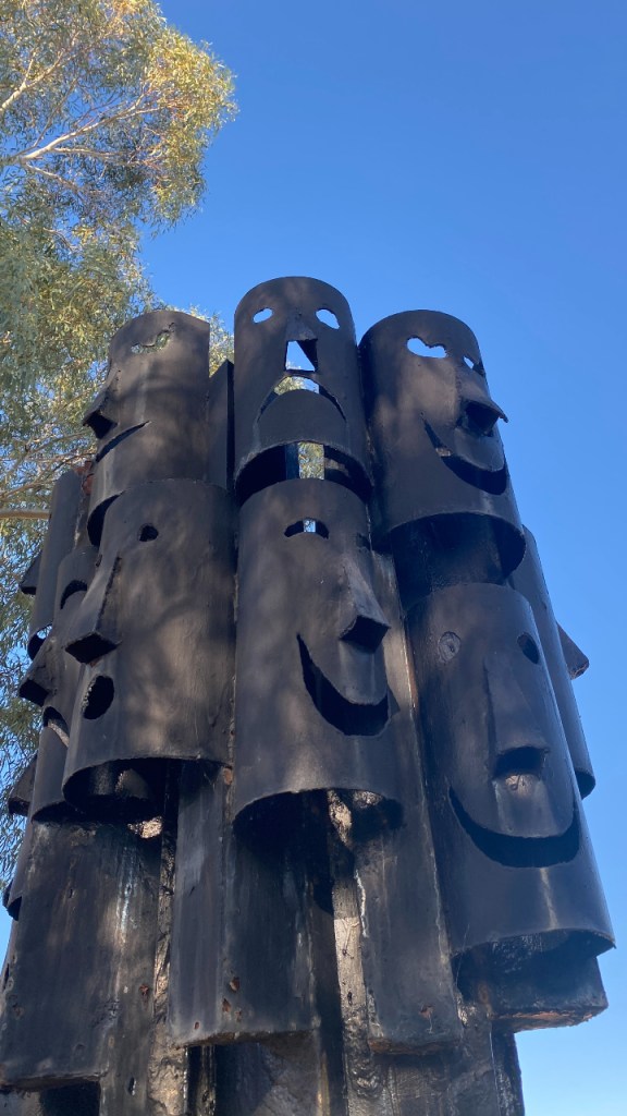 Natuurlijk heb ik het niet bij rondjes wandelen met de honden gelaten. Er is best veel te zien in en buiten Broken Hill. Natuurlijk krijgt de historie veel aandacht en dan begin je in Silverton. Dit was de plek waar voor het eerst zilver werd ontdekt (je kunt de Day Dream Mine nog bekijken, deze is echter niet meer actief). Het dorpje Silverton groeide in korte tijd uit tot een behoorlijke nederzetting maar dit was na een paar jaar alweer voorbij omdat iedereen naar Broken Hill trok. Nu kun je nog een paar gebouwen bezoeken, een biertje drinken in de bar van het Silverton Hotel en het kerkhof bezoeken waar een aantal inwoners van Silverton begraven ligt. Een prachtige serene plek, midden in de “bush”. In Broken Hill zelf zijn verschillende “heritage trails” te volgen, waarbij je aan de hand van mooie oude gebouwen veel over de ontstaansgeschiedenis kunt leren. Ook kunst neemt inmiddels een belangrijke plaats in. Er zijn diverse kunstgalerijen en men is erg trots op de lokale kunstenaars, die soms ook landelijke bekendheid genieten. Het meest trots zijn ze denk ik op de “sculptures”. Op zo’n 12 kilometer buiten het stadje is op een heuvel een soort beeldentuin gecreëerd. Eerlijk gezegd vind ik de beelden, op 2 na, niet erg indrukwekkend maar de setting is prachtig, zeker bij zonsondergang. Verder kun je nog de post van de Royal Flying Doctors en the school of the air bezoeken. Deze laatste twee instanties zijn onontbeerlijk voor de mensen in de outback. Afstanden zijn dermate groot dat men te ver van een dokter/ziekenhuis/school woont. Dus stapt de dokter in het vliegtuig om patiënten te bezoeken en krijgen kinderen onderwijs via internet. Tot slot nog heel leuk: Bell’s Milk Bar. De bar bestaat al 130 jaar en staat bekend om de milkshakes en de inrichting die uit de jaren ’50 stamt.