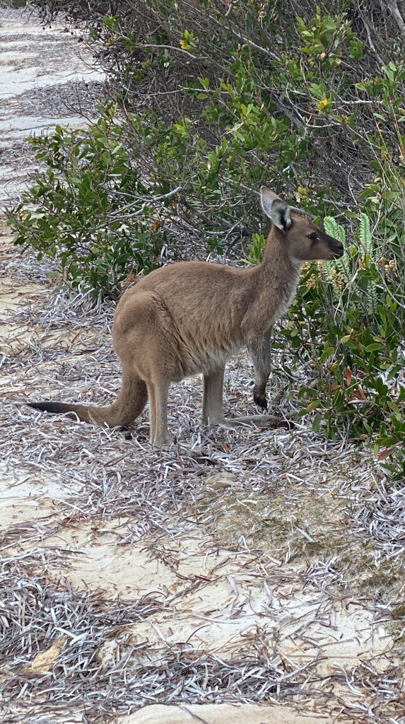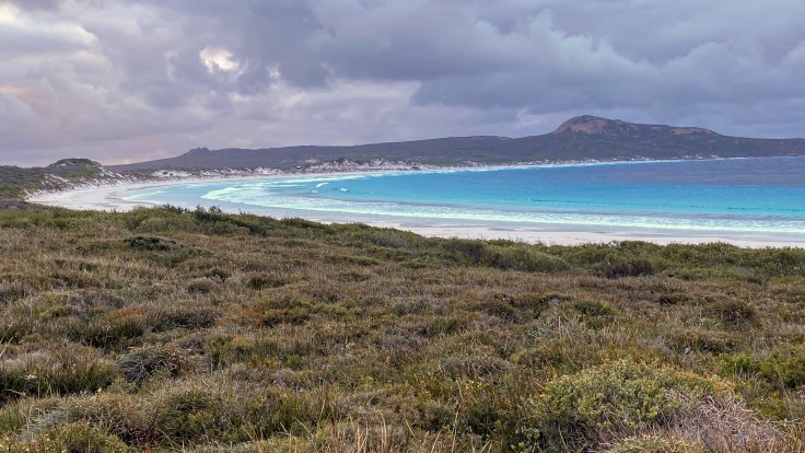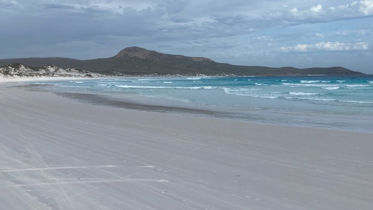 Via Esperance waar ik niet heel erg warm van word, rij ik naar Cape le Grand. Dit is een klein nationaal park ten oosten van Esperance en vooral populair door Lucky Bay. Er wordt beweerd dat daar het witste strand van Australië te vinden is, evenals kangoeroes die graag op dat strand rondhuppelen. De naam Lucky Bay is door ontdekkingsreiziger Matthew Flinders bedacht toen hij op een van zijn tochten tijdens een storm in de baai beschutting vond. Vanochtend heb ik mijn ruit maar weer eens schoon gemaakt, maar binnen een half uur is het alweer net zo vuil als daarvoor. Hoeveel insecten zou ik inmiddels al hebben vermoord? De weg richting park is zeker ook weer mooi en dan natuurlijk de vlaktes. Maar hier worden deze vlaktes wel onderbroken door erg lelijke mijnsites, de natuur wordt wel vernield hier. Het zijn soms enorme bergen, die erg afsteken tegen de verder lege horizon, zonde! Na ook weer een mooie rit door het park kom ik aan bij Lucy Bay. Wat een prachtige plek! Ik denk dat ik dit wel het mooiste strand van Australië vind. En ook de campsite is heel erg mooi. Het ligt tegen een heuvel, je kunt de baai zien als je een beetje bovenaan staat, de voorzieningen zijn uitstekend en dat er geen stroom of wifi is, is hier helemaal niet belangrijk. Het enige minpuntje is dat er vandaag weinig zon is. Wat zou het strand mooi zijn in de volle zon. Ik loop een groot deel van de baai rond en geniet van het zand dat onder je voeten knarst. Ik heb begrepen, dat dit speciaal zand is. Niet van schelpen zoals vaak het geval is, maar van quartz, dat van de rotsen af is geslepen door de wind. Het is heel fijn en lijkt meer op zout dan op zand. Ik ben voor de mooie plek gekomen, maar ook voor de kangoeroes. Dankzij geduldig wachten zie ik er uiteindelijk een tevoorschijn komen. De meeste mensen zijn dan al weg, dus die hebben pech. De kangoeroe lijkt niet erg bang en komt best dichtbij. Ik blijf behoedzaam op een afstandje want je weet maar nooit. Nadat hij lekker wat blaadjes heeft gegeten huppelt hij over het strand weg. Missie geslaagd, al had ik het natuurlijk wel meer willen zien