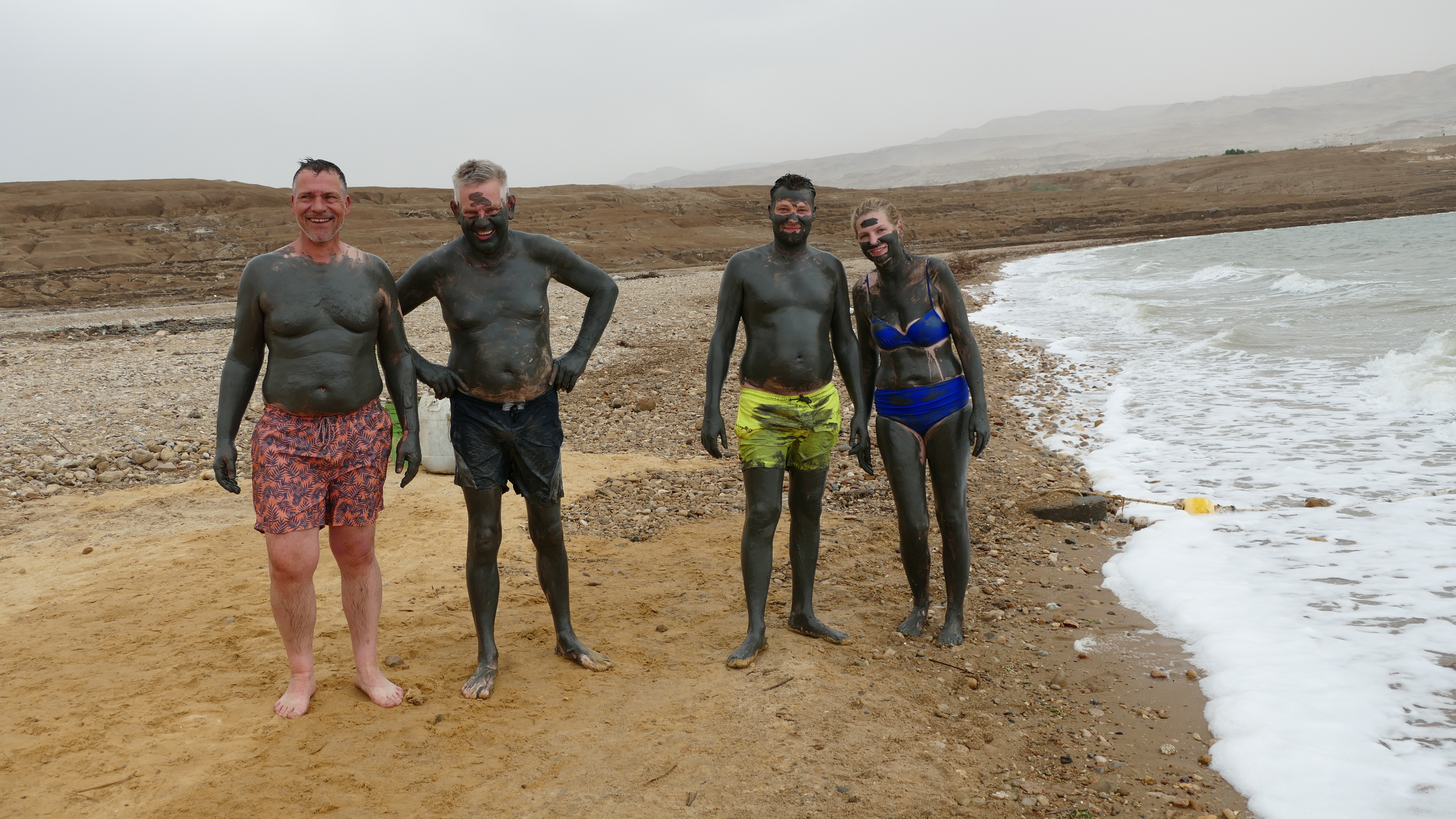 Als je in de buurt van de Dode Zee bent, dan moet je natuurlijk ook even drijven in het zoute water. Dus duiken we met zijn allen het water in, nadat de lichamen zijn ingesmeerd met dikke lagen modder wat een goed middel tegen huidproblemen schijnt te zijn. Maar voor iedereen is het vooral een moment om lol te trappen want het ziet er bijzonder uit, al die ingesmeerde figuren. De zee is helaas te ontstuimig om lekker rustig te drijven, dus de meesten houden het niet lang vol. Maar het is wel leuk om eens te hebben ervaren hoe het is.