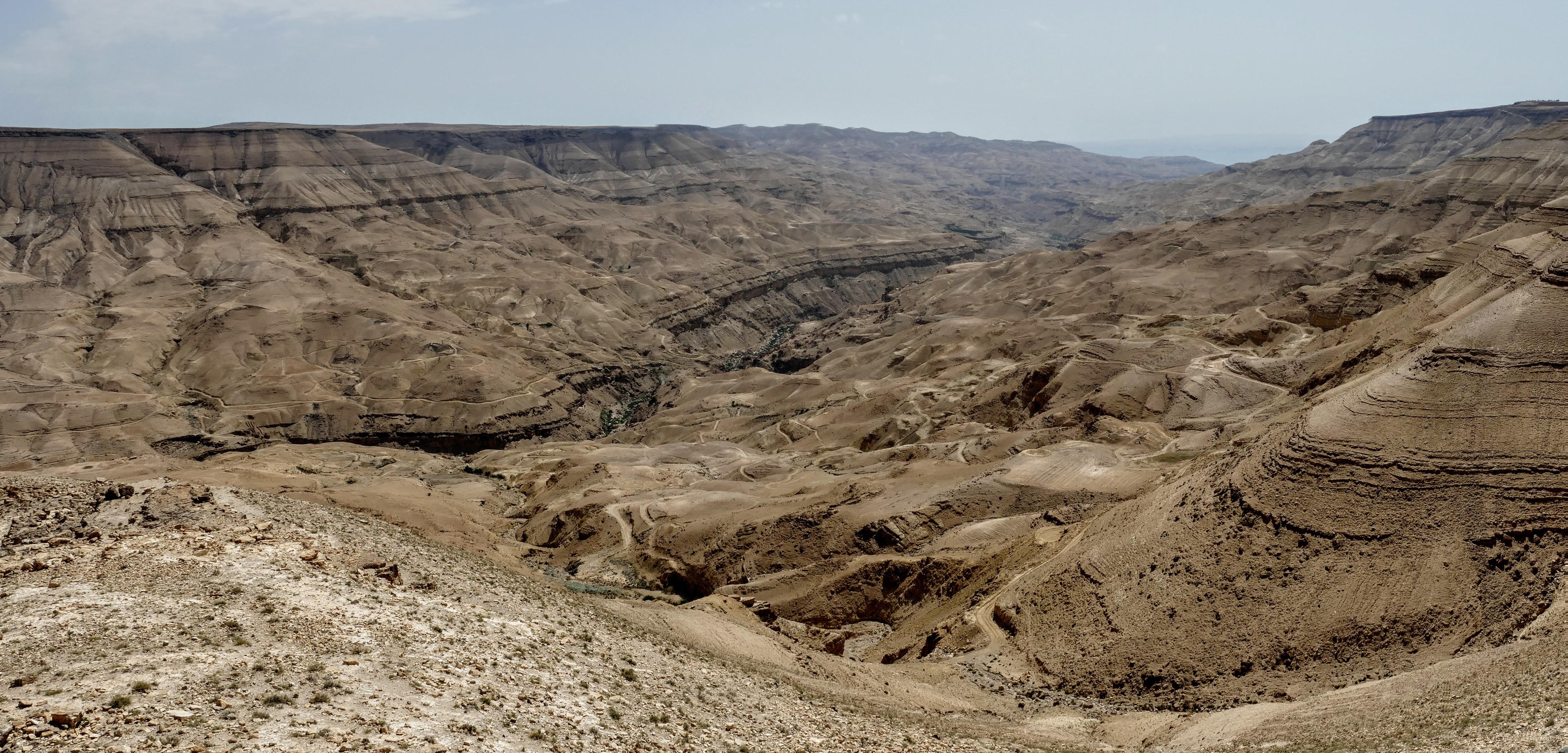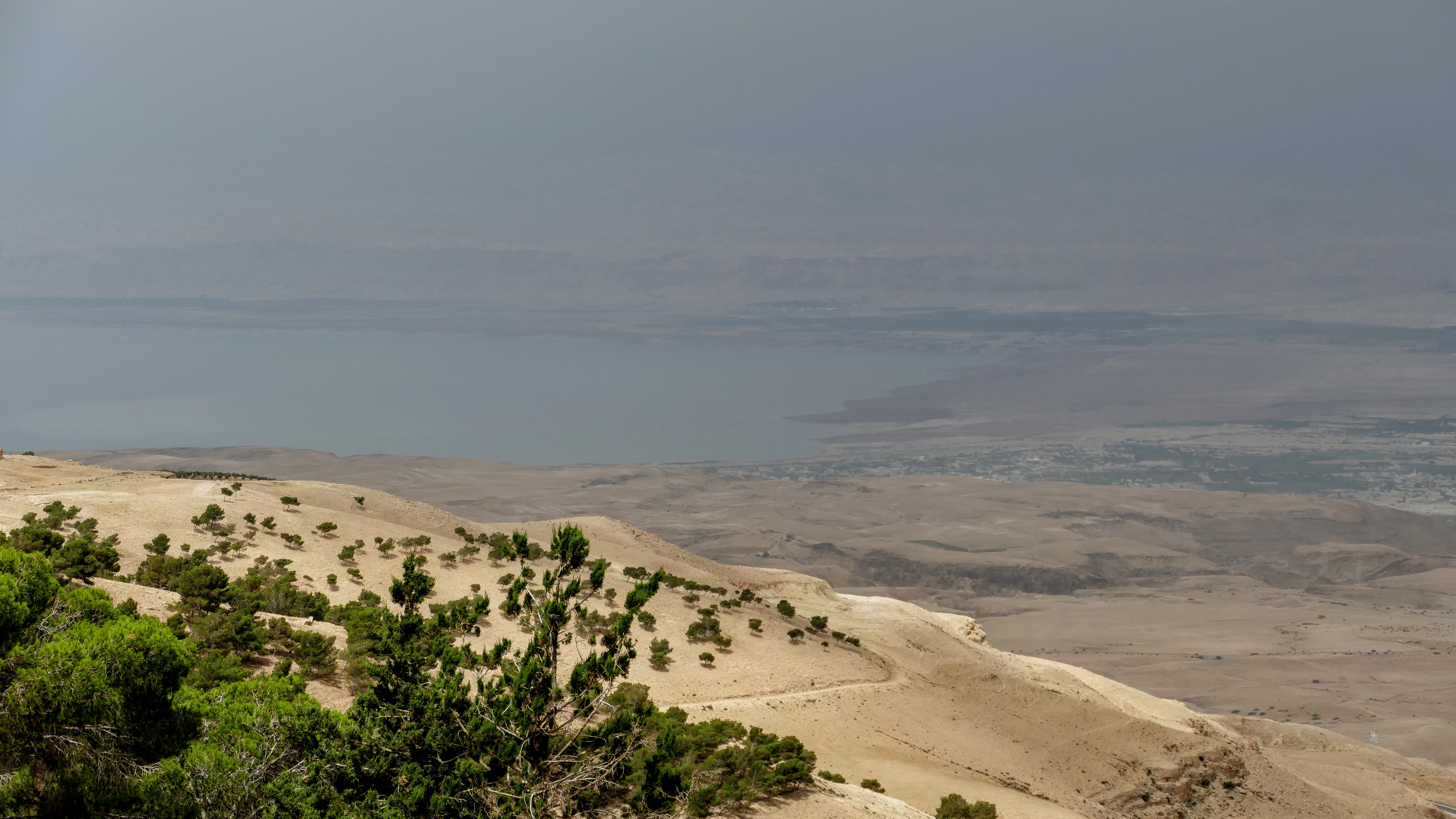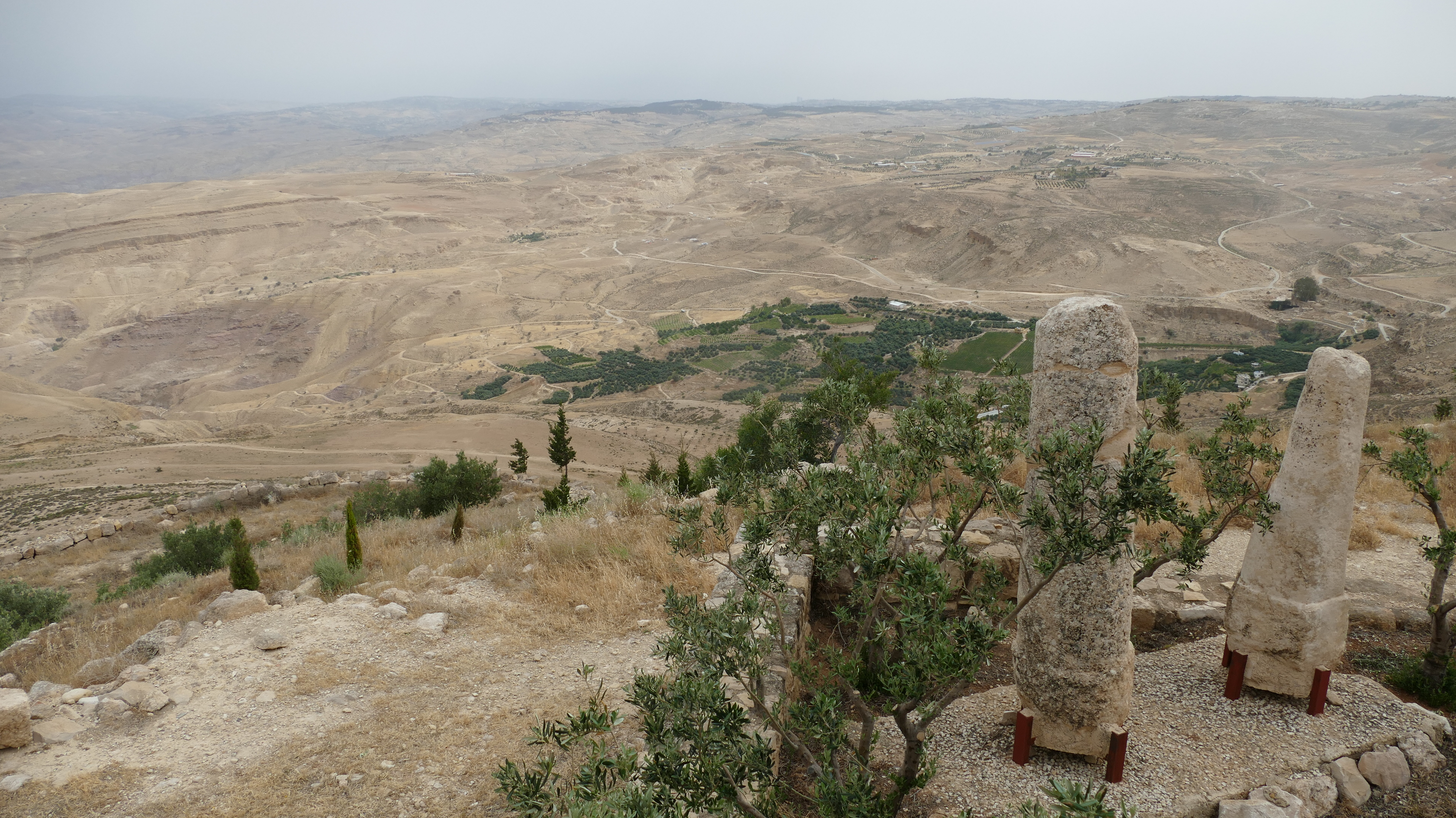 Mount Nebo, lokaal de Mozesberg genoemd, is de berg die in de Bijbel een belangrijke plek inneemt. Hier zou Mozes zijn 10 geboden hebben ontvangen etc. Vanaf de top van de berg kijk je uit over de de Jordaanvallei, de Dode Zee en, ook hier, zou je Jerulazem, Jericho en Bethlehem moeten kunnen zien. Alweer zou, want ook hier is de lucht niet helder genoeg. Maar het is wel een vreemd idee om hier te staan en te weten dat aan de overkant van de vallei de voor velen zo belangrijke plekken liggen.