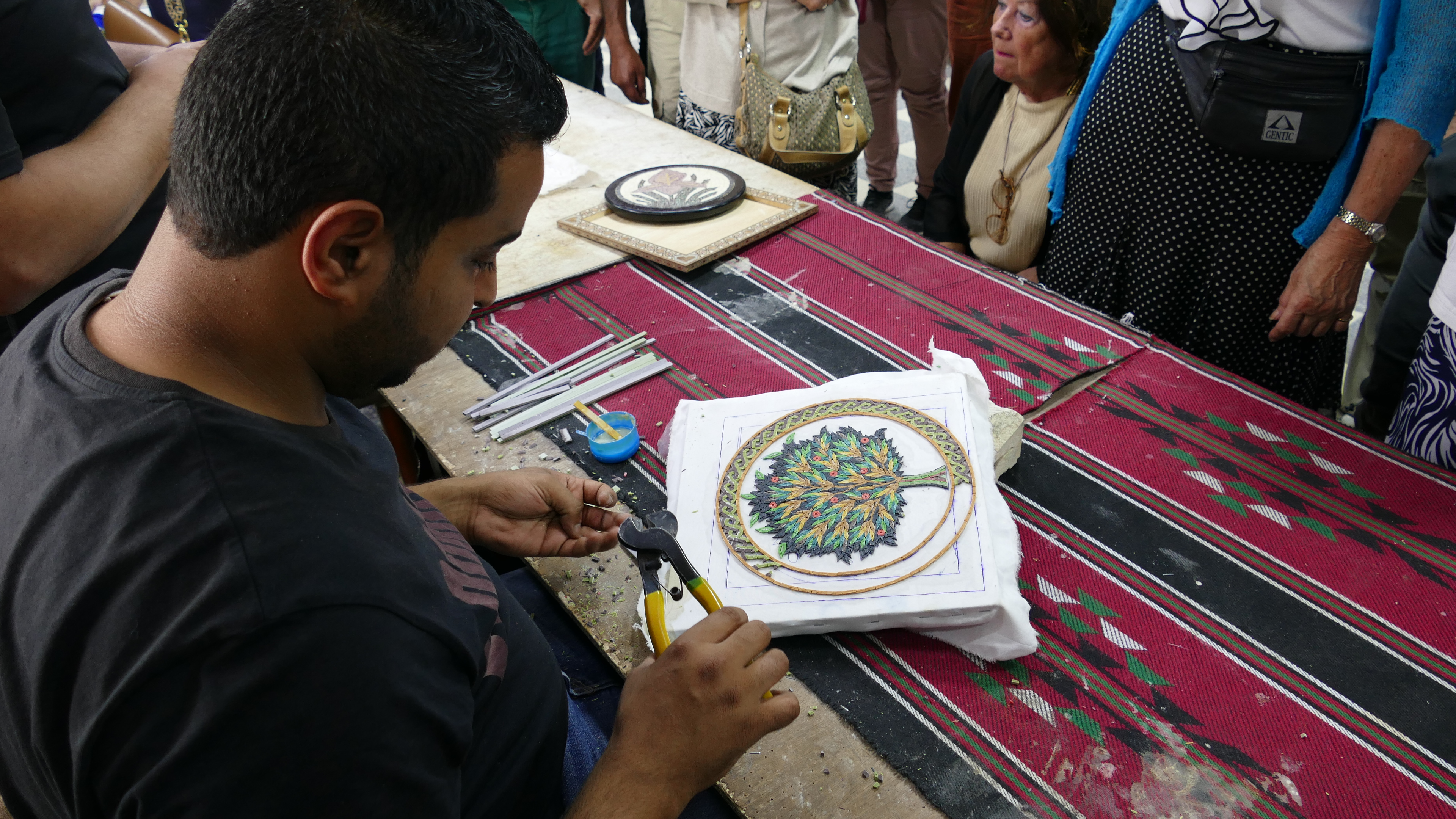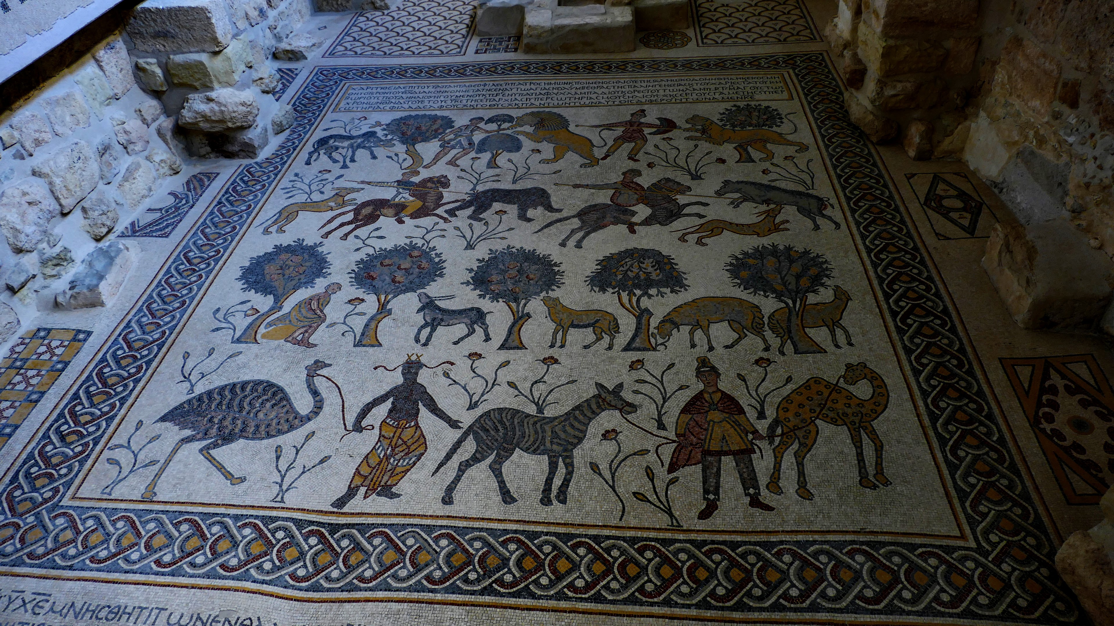 Onderweg naar Petra, het hoofddoel van deze reis, maken we een aantal tussenstops. Na de Mozesberg en een heerlijke lunch (vooral de moussaka was heerlijk) stoppen we bij een mozaïek-atelier, gesponsord door de koningin Noor foundation. Heel leuk om te zien hoe hier sieraden, schilderijen, borden, schalen en emoe-eieren worden verfraaid met soms minuscuul kleine steentjes, stof bijna. Ik vind het mooi om te zien, maar helaas is het erg arbeidsintensief en daardoor erg duur. En hoewel ik een paar prachtige oorhangers zie, heb ik daar geen 250 JOD voor over. In Madaba stoppen we om het beroemde mozaïek in de Sint Joriskerk te bekijken. Het mozaïek is hier goed bewaard gebleven, net zoals in het klooster bovenop de Mozesberg. Onze volgende stop is een uitzicht over de Grand Canyon van Jordanië. Hier zien we ook weer de Dode Zee, maar ook hoe droog het land is. De rivier is er niet, in ieder geval niet zichtbaar al groeien er wel wat planten dus af en toe zal de bedding zich wel vullen met water. En de laatste stop voordat we aankomen bij Petra is het Shobak kasteel, een imposant kruisvaarderskasteel, hoog gelegen op een heuvel in een ruig landschap. En hoewel ook hier weer een ruïne is alleen de aanblik van een kasteel op deze plek alweer de moeite waard. Je kunt het kasteel bezoeken, maar we hebben al een lange dag achter de rug en er is weinig animo voor. Ik denk vooral ook omdat je een flink stuk moet klimmen om er te komen. Op naar Petra dus maar.