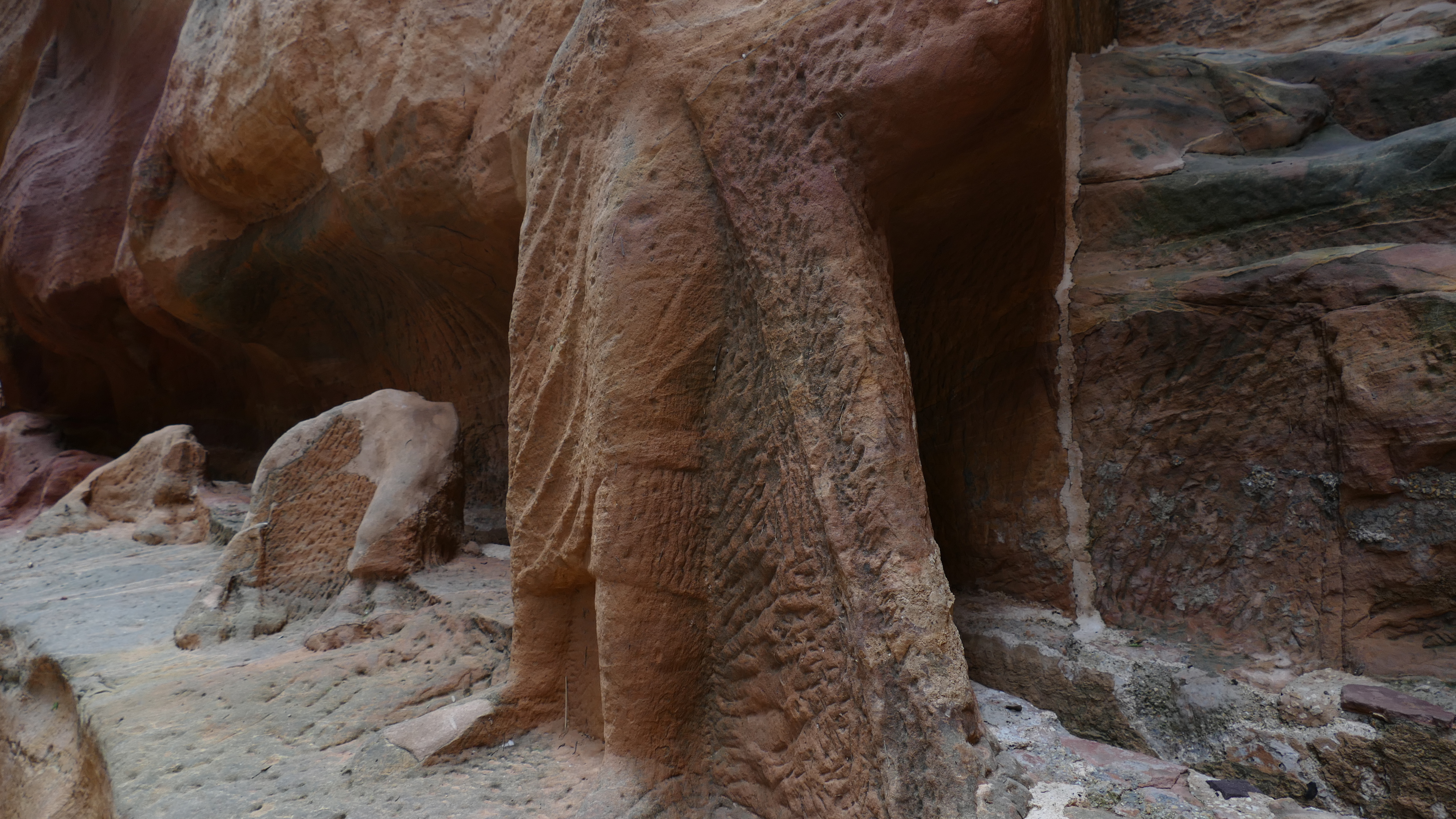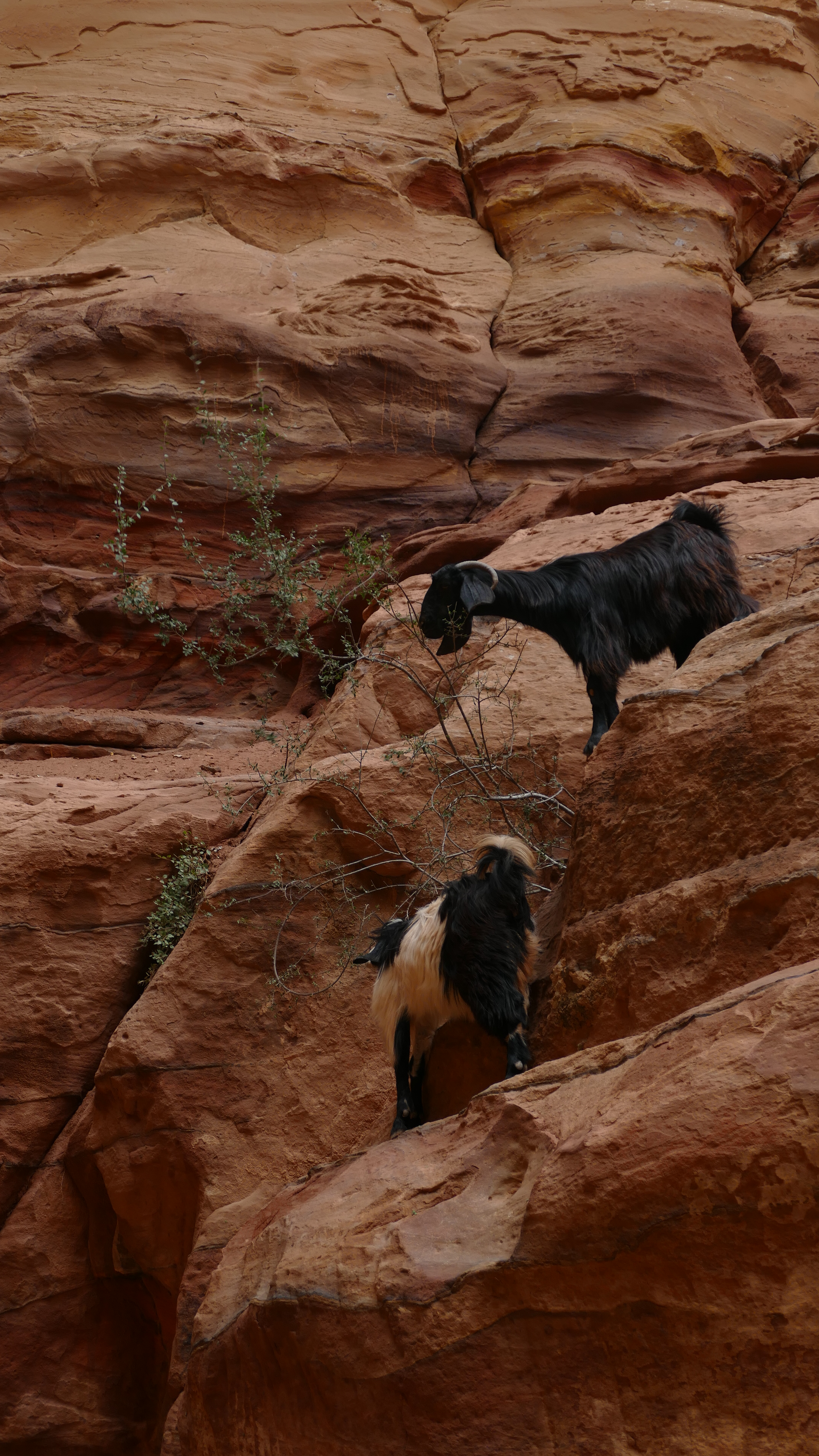 Voordat we in Klein Petra aankomen, rijden we door het dorp dat op de rand van de vallei bij Petra is gebouwd voor de Bedoeïnen die ten tijde van de ontdekking van Petra nog in de grotwoningen woonden. Nu hebben ze hun eigen huizen en de meesten van hen zijn werkzaam in de vele, vele souvenirsstalletjes die je in Petra kunt vinden. Wat een overgang zal dat zijn geweest voor de eersten die van de grotten naar de huizen moesten verhuizen. Klein Petra, de naam zegt het al, is het kleine zusje van Petra. Maar de plek bestaat al veel langer. De Bedoeïnen hadden hier ook al hun grotwoningen en opslagruimtes ver voordat de Nabateeërs Petra bezetten. Maar het concept is hetzelfde. Je komt eerst door een kloof, al is het hier meer een kloofje en vervolgens in een grote open ruimte tussen de rotsen, waar je ook weer diverse grotten en gebouwen vindt. Ook dit is weer een mooie plek.