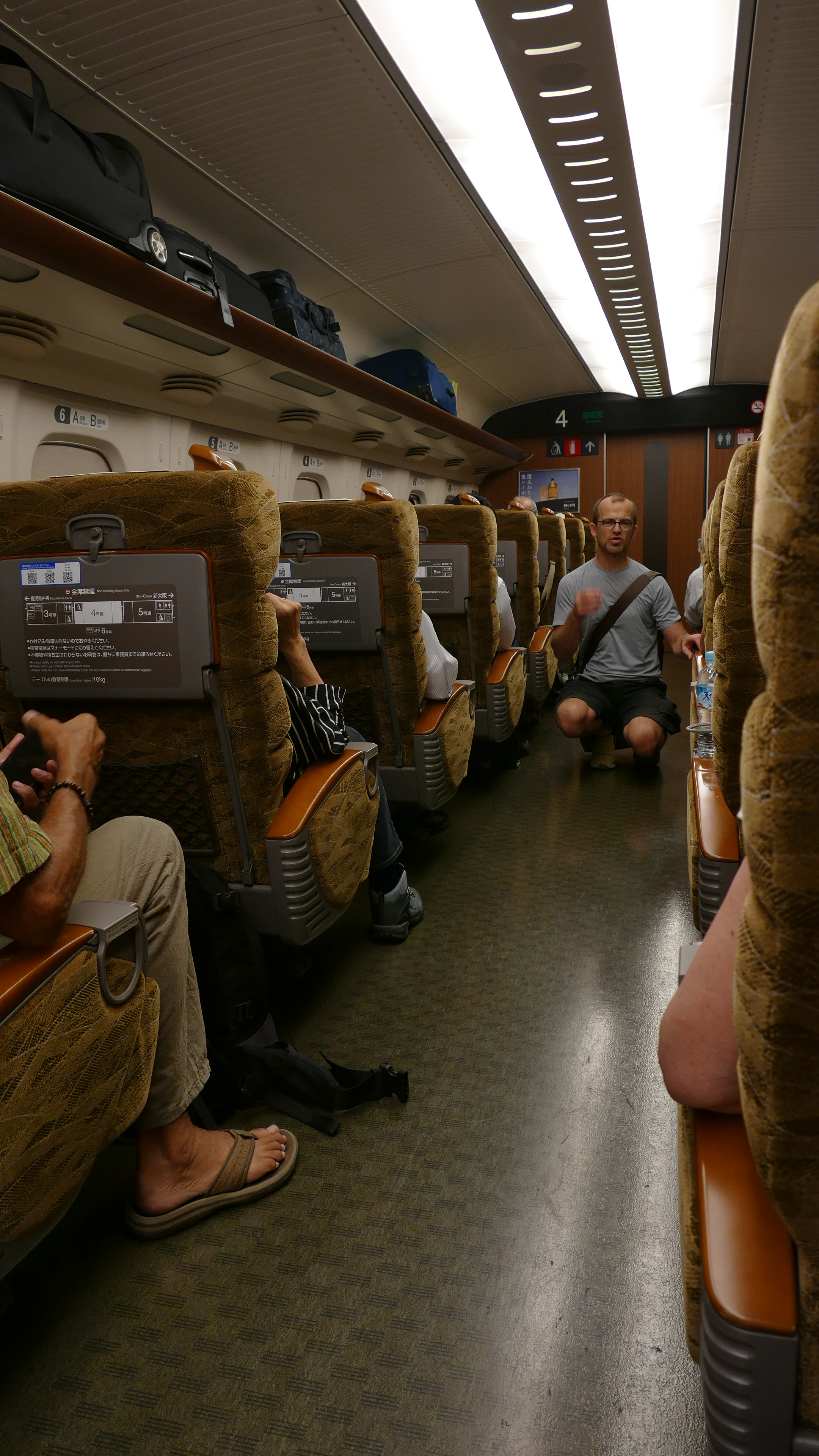 Fukuoka is het startpunt van de reis. De vlucht via Hongkong is langer dan ik verwachtte maar dat komt voornamelijk door een lange wachttijd in Hongkong. Veel tijd om bij te komen heb ik echter niet, want we blijven maar 1 nacht in deze stad. Dus na een korte avondwandeling lig ik op tijd in bed om even bij te slapen en de volgende ochtend staan we al vroeg op het station om de “bullettrain” naar Kagoshima te pakken. De eerste treinreis van vele die nog zullen volgen. En het is even wennen. Er is weinig Engels te vinden op het perron dus alleen al een toilet vinden is een hele opgave. Gelukkig hebben we een gids bij ons, die uitstekend Japans spreekt. Hij regelt ook de kaartjes etc. Handig voor mij want dan weet ik straks, wanneer ik zonder groep verder reis, hoe het werkt. De bullettrein (de Shinkansen) is een zeer comfortable trein die met zo’n 300 km per uur in letterlijk sneltreinvaart de afstand naar Kagoshima aflegt.