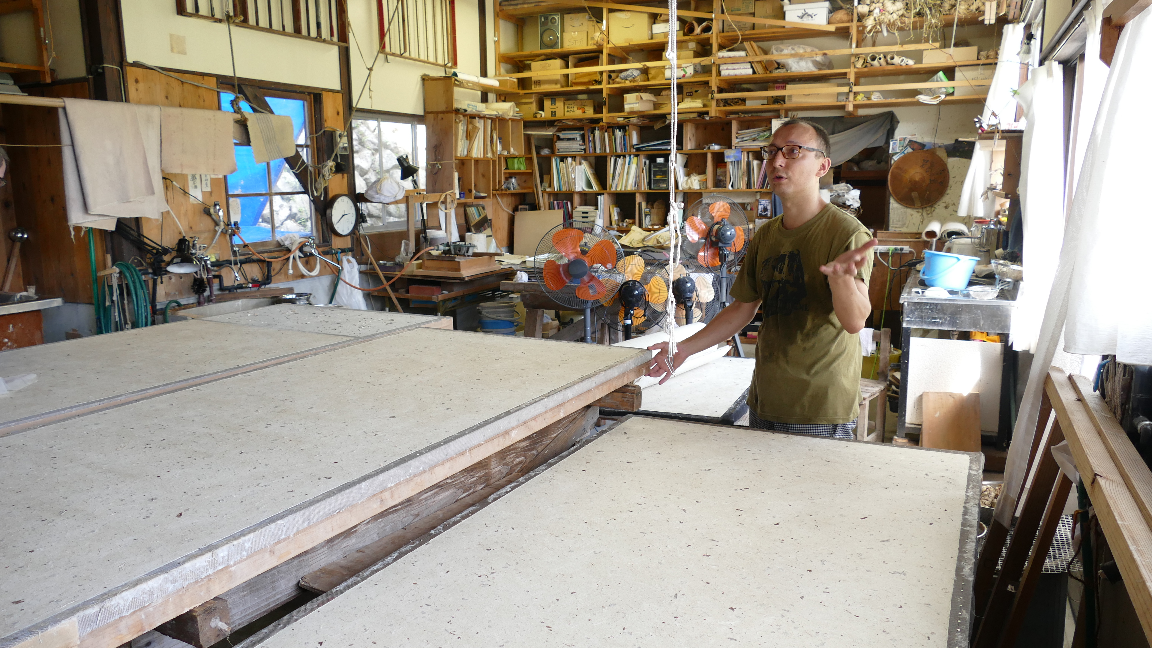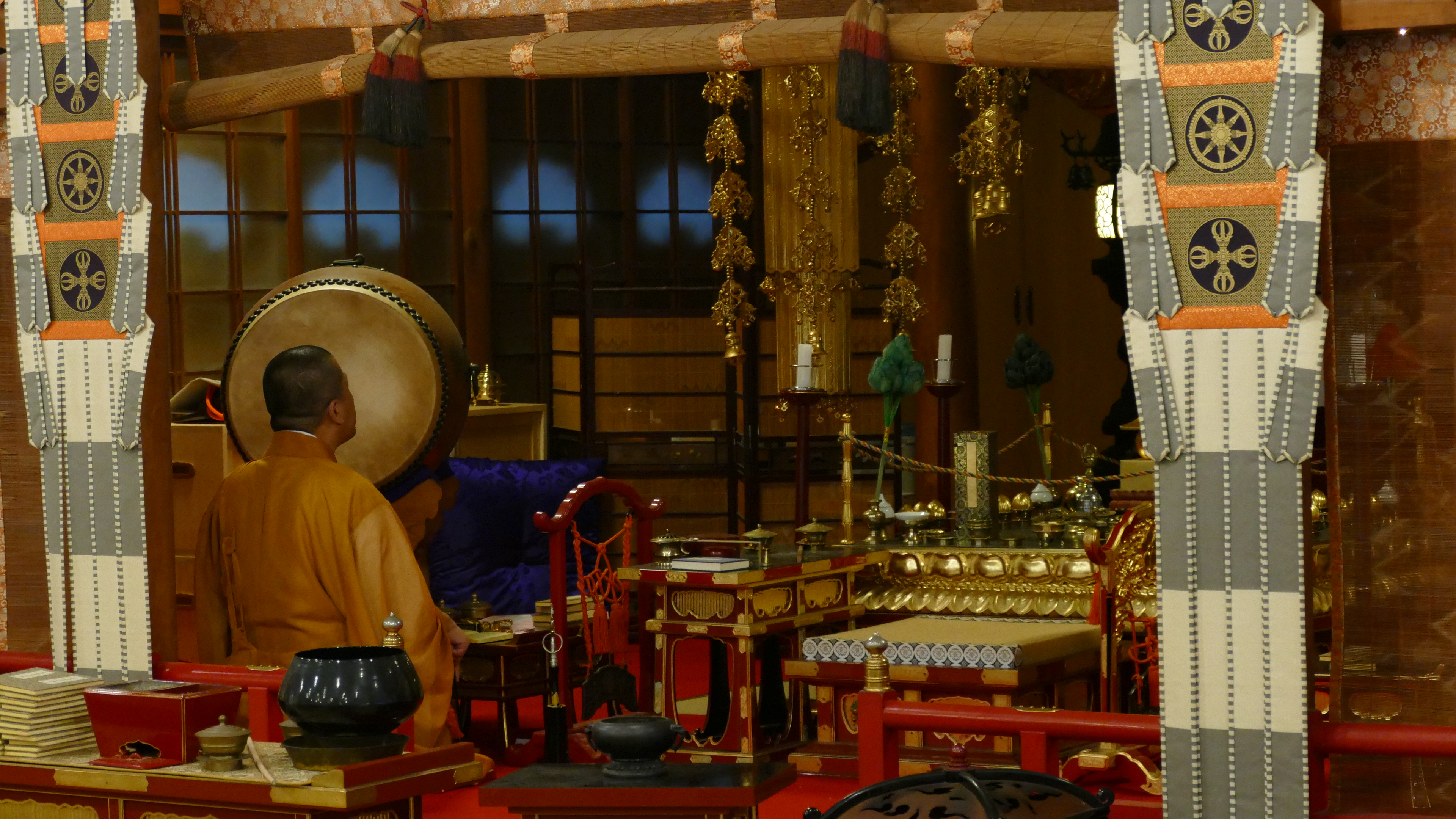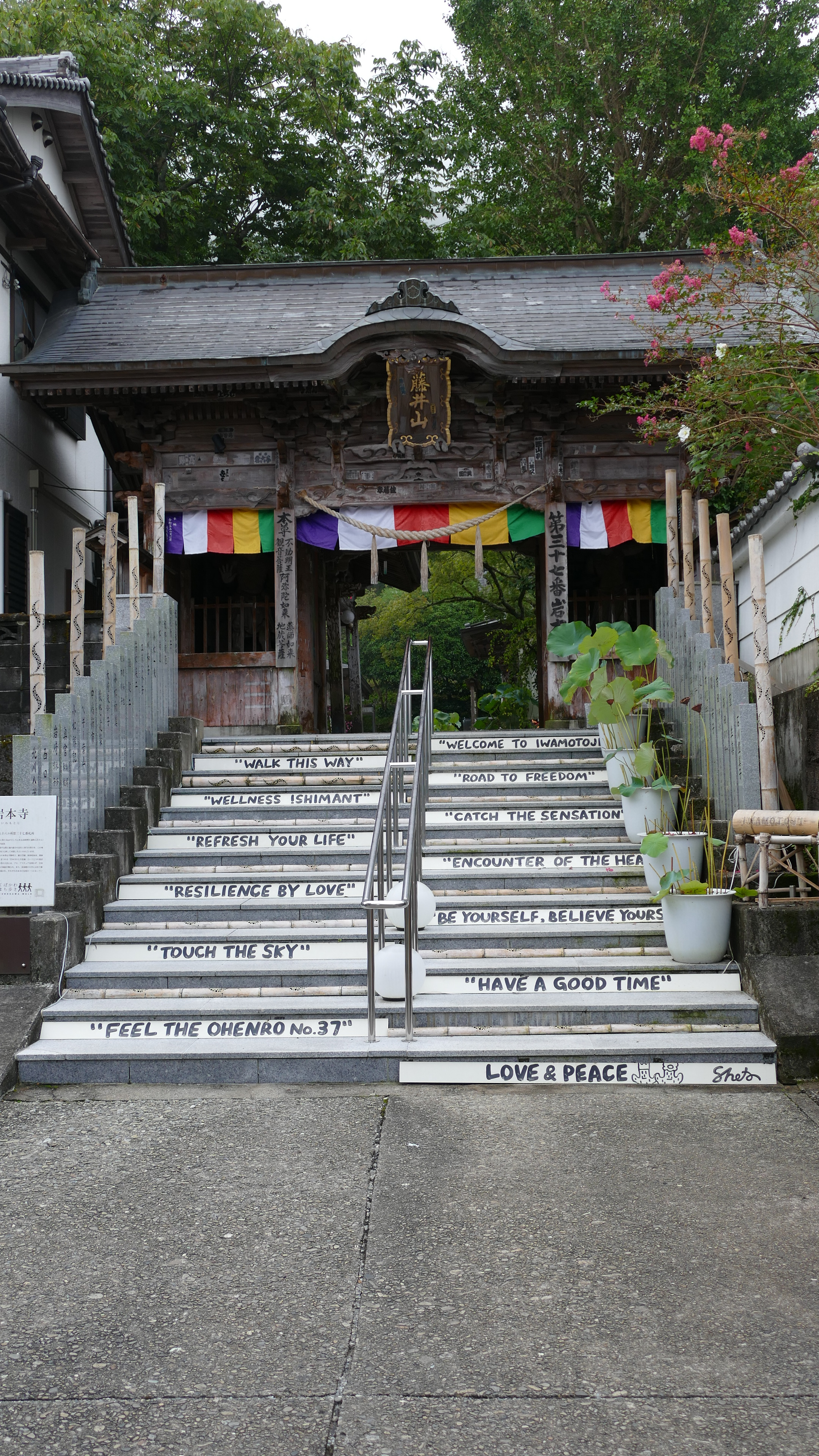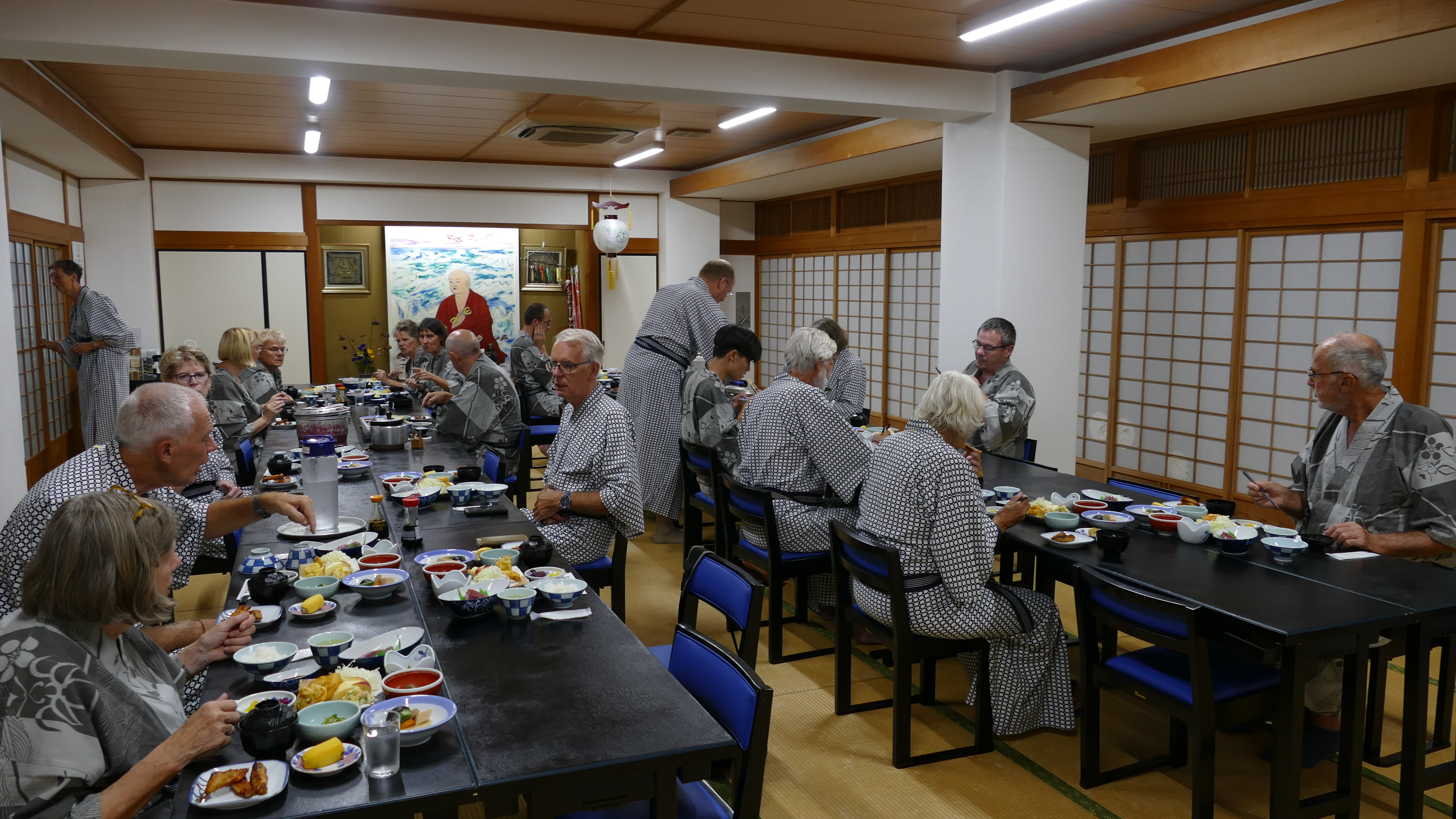 Japan bestaat uit vele eilanden en dat betekent dat we vroeg op moeten voor de ferry van het eiland Kyushu naar Shikoku. Een rustig tochtje en na 2,5 uur staan we weer aan wal. Daar staat eeen bus op ons te wachten. Vanaf vandaag is de bus voor een paar dagen ons vervoermiddel. De treinreizen van de afgelopen dagen zijn prima bevallen,, maar met de bus is het toch iets leuker vind ik. Je kunt nl. op meer plekken stoppen en bent niet zo vast aan tijden gebonden. We maken dan ook een stop op een plek waar we met een trein nooit hadden kunnen komen. Diep in de bergen, waar we het laatste stukje moeten lopen, staat een papier’fabriek’. Het is niet echt een fabriek te noemen, maar ze zijn er hier zelf zo trots op dat we het maar overnemen. Ook hier weer Nederlandse invloed want het blijkt Rogier Uittenboogaard te zijn, die hier zo’n 35 jaar geleden is begonnen met het handmatig fabriceren van papier. De verkoop van het papier gaat niet meer zo goed, maar hij heeft dat gecompenseerd door op zijn eigen papier te gaan tekenen en schilderen en dat schijnt lucratief te zijn. De techniek is nog steeds ongeveer hetzelfde en zijn zoon laat ons zien hoe dat in zijn werk gaat. Hoewel ik het bijzonder vind dat iemand hier papier maakt, geniet ik vooral van de omgeving, want het is hier echt prachtig. We eindigen onze dag bij een van de tempels, die samen de Shikoku Henro pelgrimstocht vormen, een rondwandeling langs de kust waarbij je 88 tempels bezoekt. Een bijzondere ervaring om hier te zijn, want dit is onze slaapplek voor vannacht. We slapen op de grond op futons (dunne matrassen), krijgen allemaal een yukata (een soort kimono) die we dragen bij de shojin-riory (een traditionele boeddhistische maaltijd). Gelukkig liggen er in de kast nog meerdere futons en ik stapel er drie op elkaar om toch nog enigszins lekker te liggen. Ik voel me wel net de prinses op de erwt. We moeten er de volgende ochtend ook al weer vroeg uit (alleen als je dat wilt), want om 6 uur kun je een dienst bijwonen. Ik verwacht een aantal monniken in de tempel te zien, maar er is er maar één. Die wel een mooie gebedsdienst heeft gehouden. Het ontbijt daarna is ook traditioneel, maar in tegenstelling tot het diner van gisteravond, sla ik deze maaltijd grotendeels over. Not my cup of tea! We gaat er nu ’s ochtends om 7 uur al aan de gerookte makreel etc.?