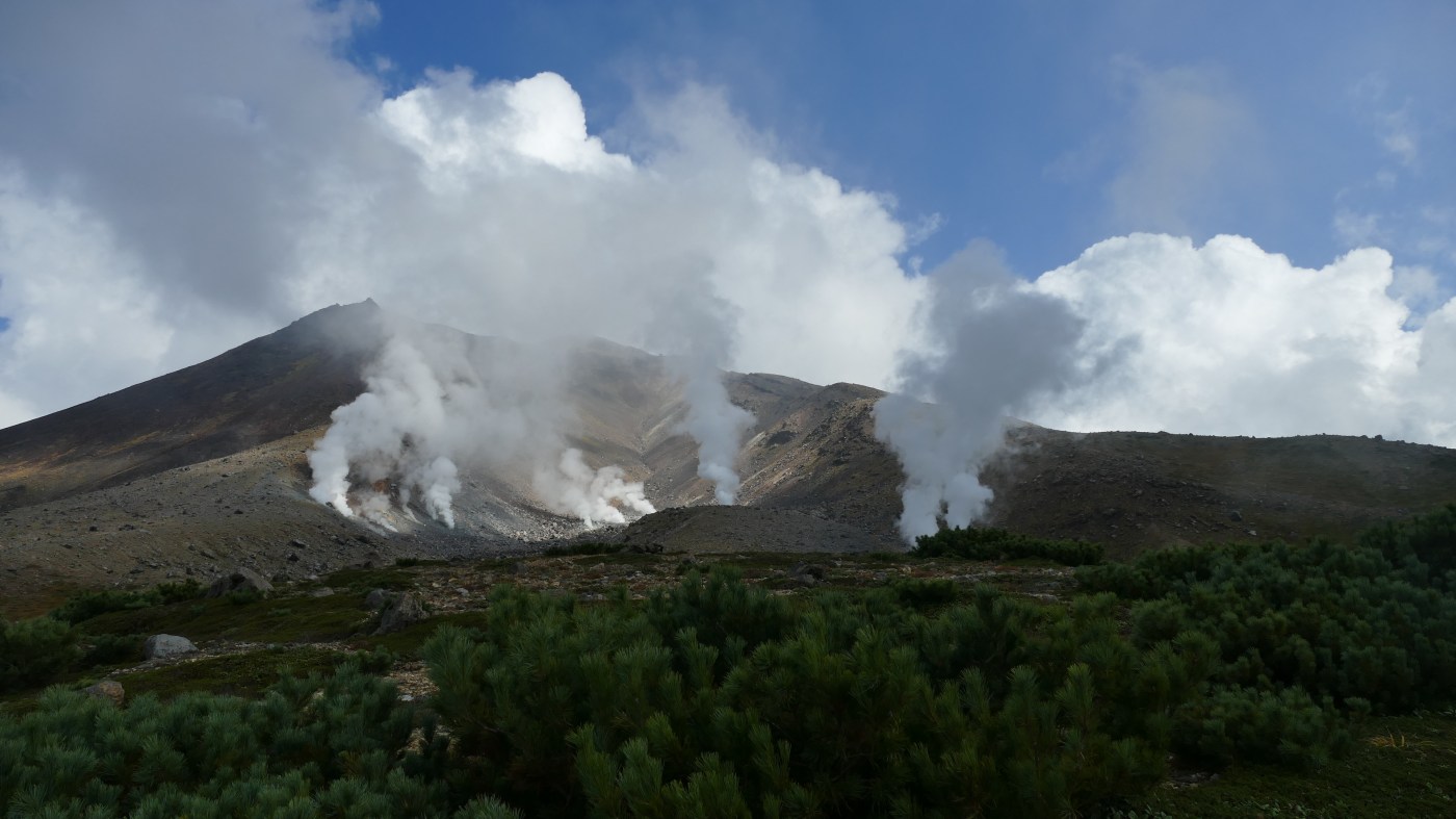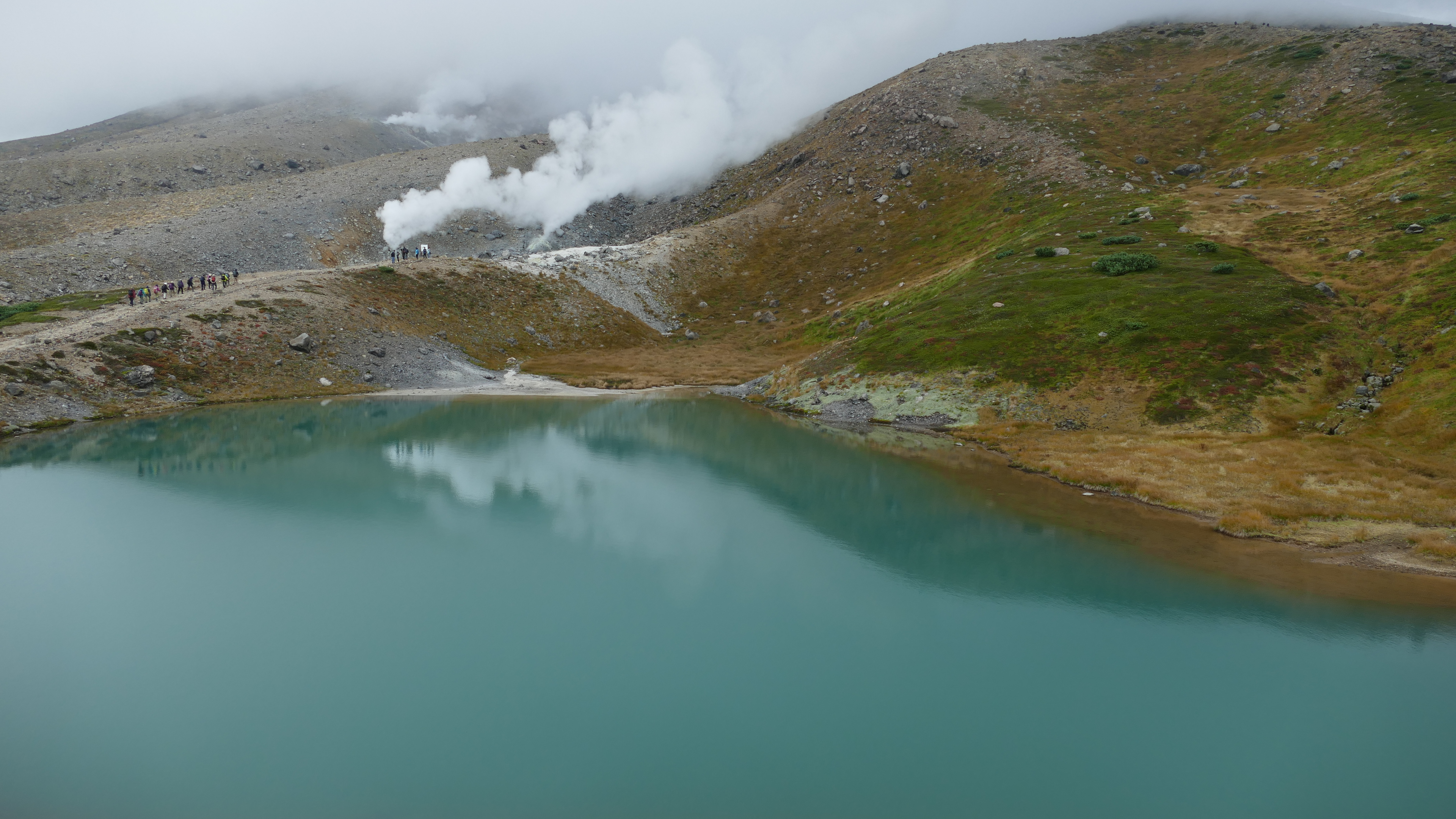 De Engelsen hebben de naam dat zij altijd keurig in de rij staan en achteraan sluiten bij een bus- of tramhalte. Japanners zijn daar m.i. nóg beter in. Het valt dan ook echt op wanneer je met een man of 12 achter aan sluit, maar gewoon in een groepje bij elkaar blijft staan. We maken het daardoor verwarrend voor de Japanners want ze weten nu niet achter wie ze moeten aansluiten wanneer we klaar staan voor onze busrit naar het nationale park Daisetzuan waar we op de vulkaan Mount Asahi-dake gaan wandelen. Hoewel het een werkende vulkaan is, is de laatste echte uitbarsting alweer bijna 300 jaar geleden. De wandeling is heerlijk, we lopen boven de boomgrens en zijn blij met de toeristen die een berenbelletje aan hun rugzak hebben gehangen. Want er lopen hier beren rond. Gelukkig is het goed weer, want de wandeling schijnt vaker niet dan wel te kunnen worden uitgevoerd vanwege het slechte weer. Ik zie de hele berg, al is het maar voor een moment en de rookpluimen zijn duidelijk zichtbaar. Het laatste deel van de wandeling loop ik helaas wel in de mist want het weer in de bergen is zeer veranderlijk. In de bus terug naar het hotel is wel te zien dat het voor een aantal mensen een zeer vermoeiende dag was…