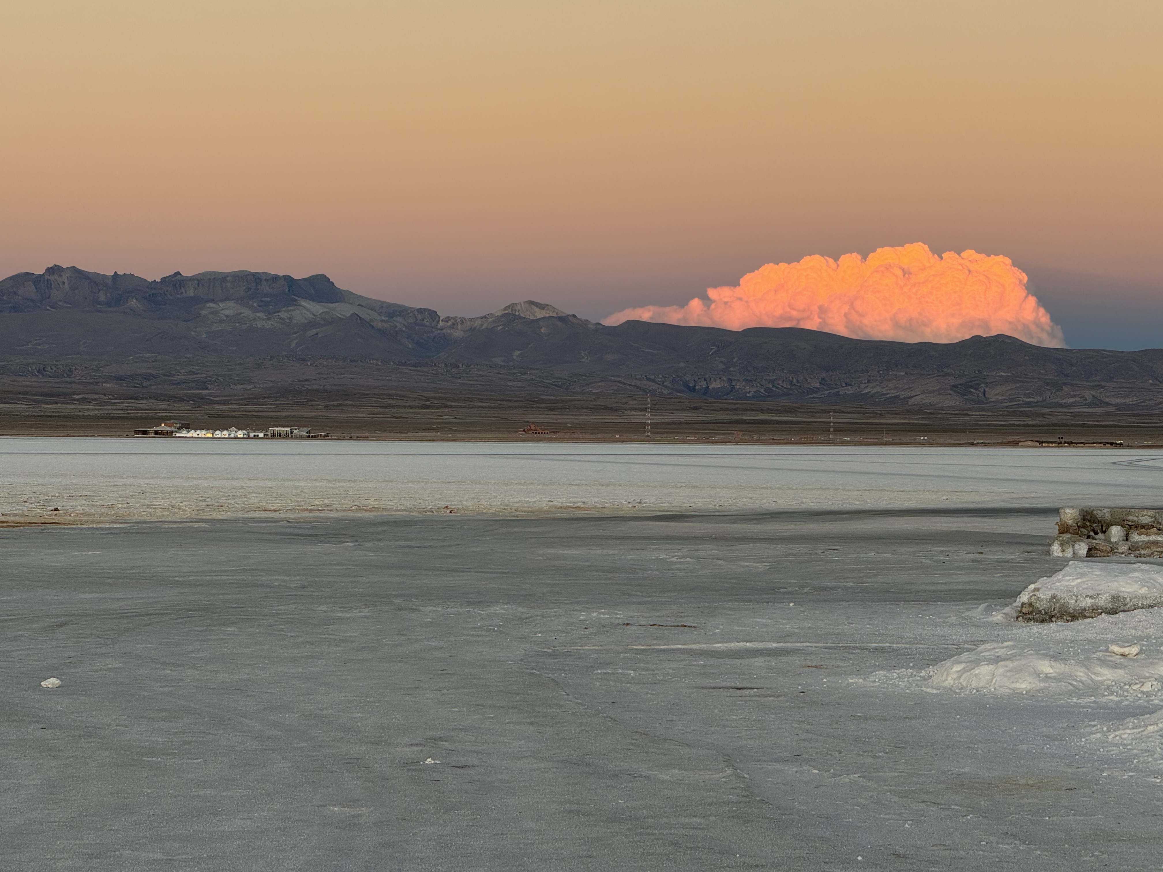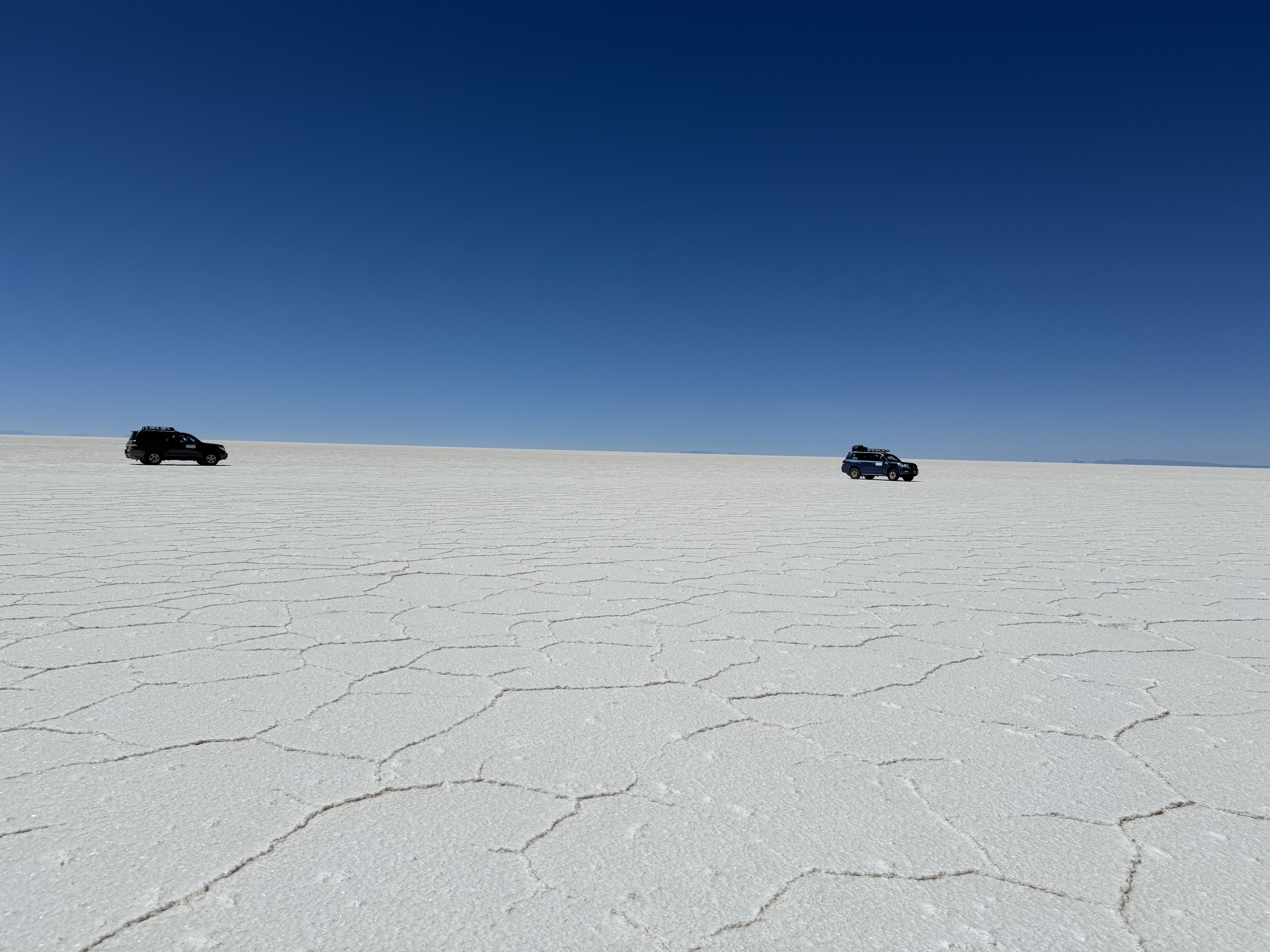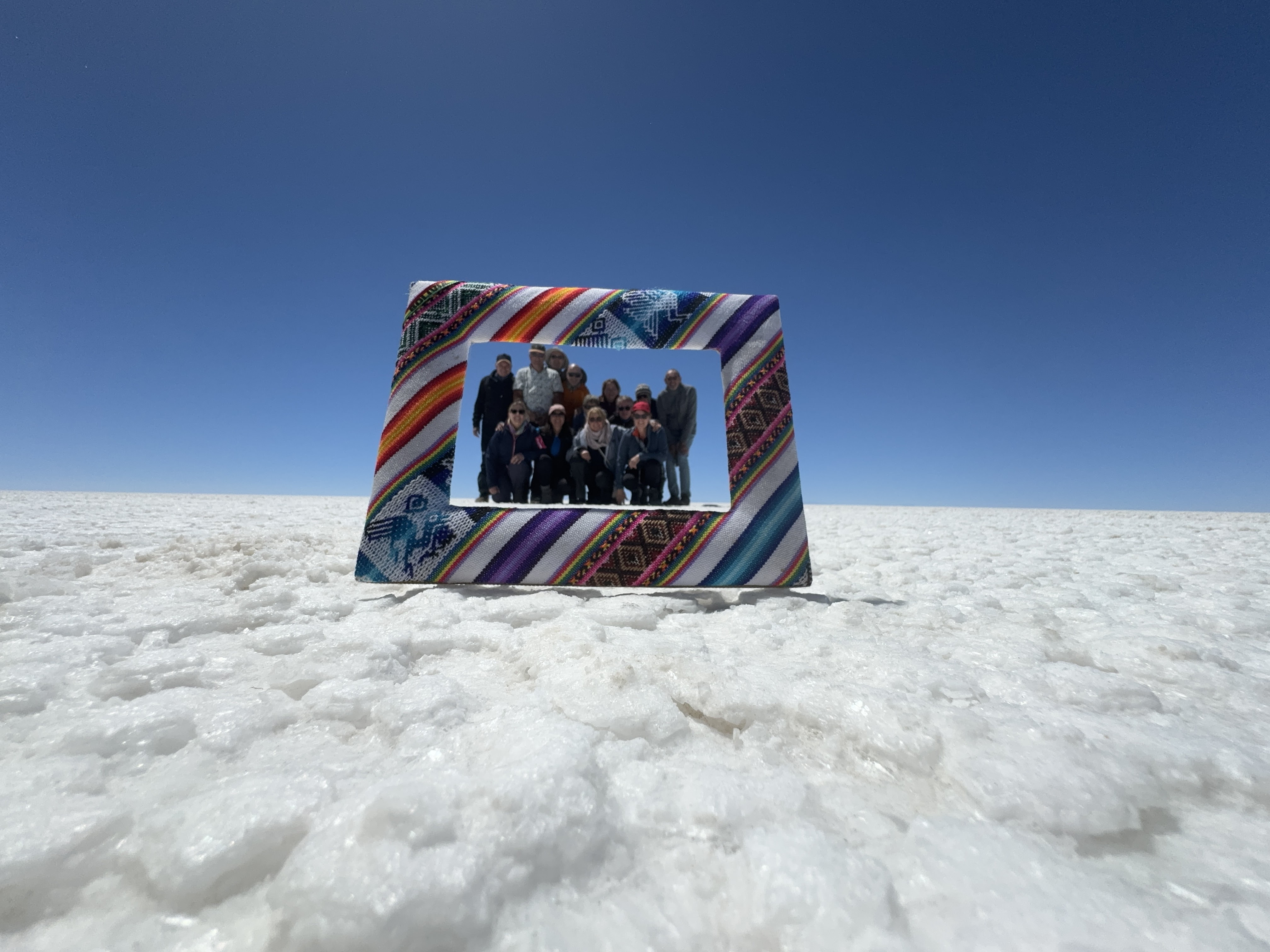 En als je denkt dat je nu toch wel het allermooiste van de reis hebt gezien, ga je de Salar de Uyuni op. Een enorme zoutvlakte (oppervlakte 12.500 km2) waarop we ons de hele dag vermaken. Je hebt het gevoel dat je over een grote sneeuwvlakte rijdt en verwacht elk moment dat de auto wegglijdt. Maar dat is natuurlijk niet zo. We verlaten ons “zouthotel” (zelfs de bedden zijn van zoutblokken gemaakt) en stoppen bij een doolhof, uiteraard ook van zout gemaakt. We vermaken ons er prima mee en ik moet zeggen dat het verdomd moeilijk is om de uitgang te vinden. Daarna is het tijd voor de creatievelingen. Op deze enorme kale vlakte kun je mooie foto’s maken door met perspectief te spelen. De mooiste creaties komen voorbij en voor we het weten is het alweer tijd voor het volgende verrassende natuurverschijnsel: cactuseiland. Hoewel grotendeels vlak zijn hier en daar wel eilanden aanwezig. Cactuseiland (Incahuasi) is de bekendste. Een klein eiland helemaal bezaaid met verschillende soorten cactussen, die mooi afsteken tegen een achtergrond van witte zoutvlakte en blauwe lucht. We maken een wandeling over het eiland waarbij flink geklauterd moet worden. De hoogte (hier ongeveer 3.600 meter) maakt het ons nog steeds lastig maar we raken er wel meer aan gewend. En vóór dit mooie tafereel wordt voor ons, midden op de zoutvlakte, een lunch geserveerd. By far de mooiste lunchplek die ik ooit heb gehad. Na een bezoek aan het eerste zouthotel dat nu als museum is ingericht is het alweer tijd voor een zonsondergang. Niet heel spectaculair moet ik zeggen maar toch wel mooi.
