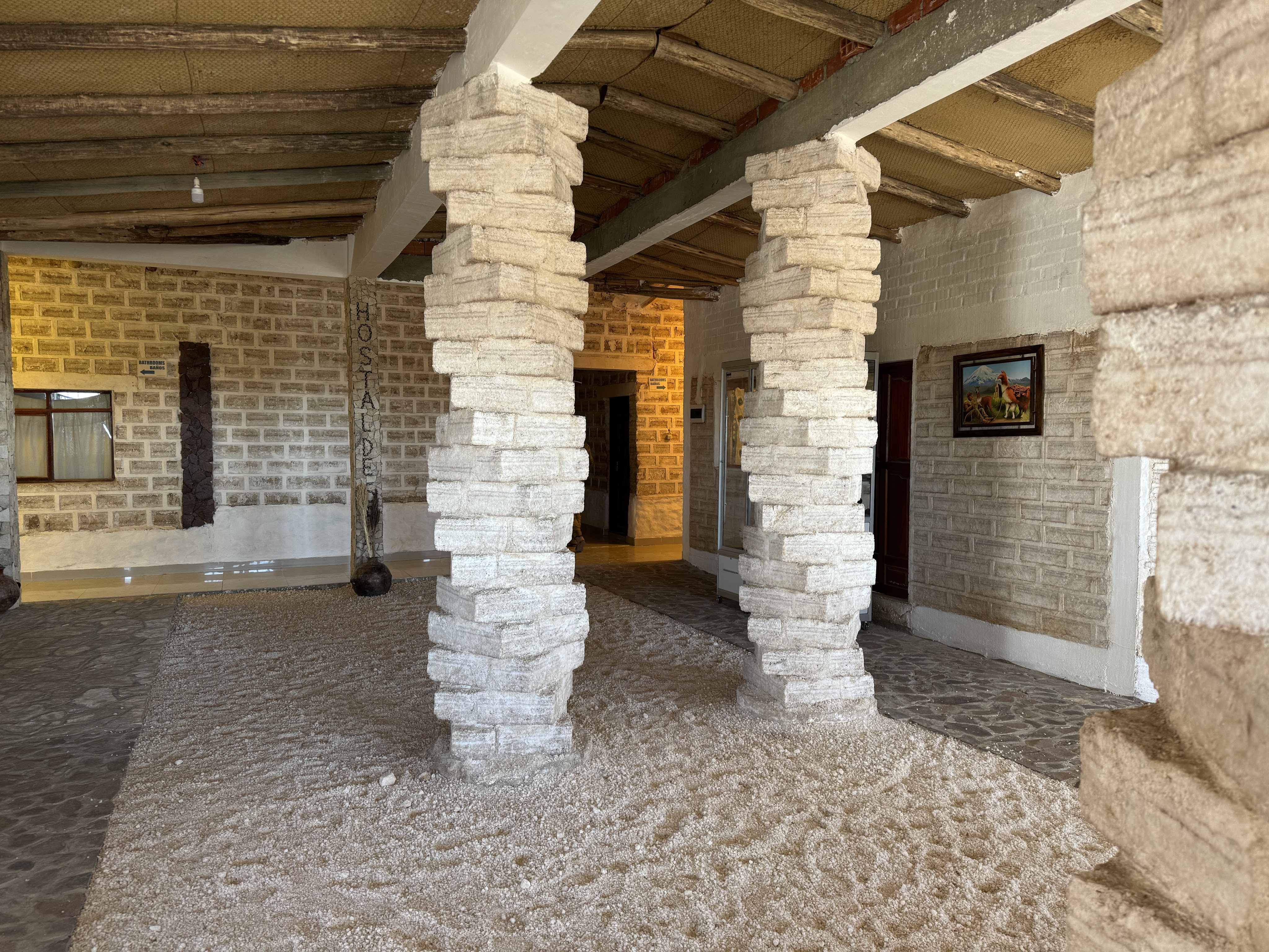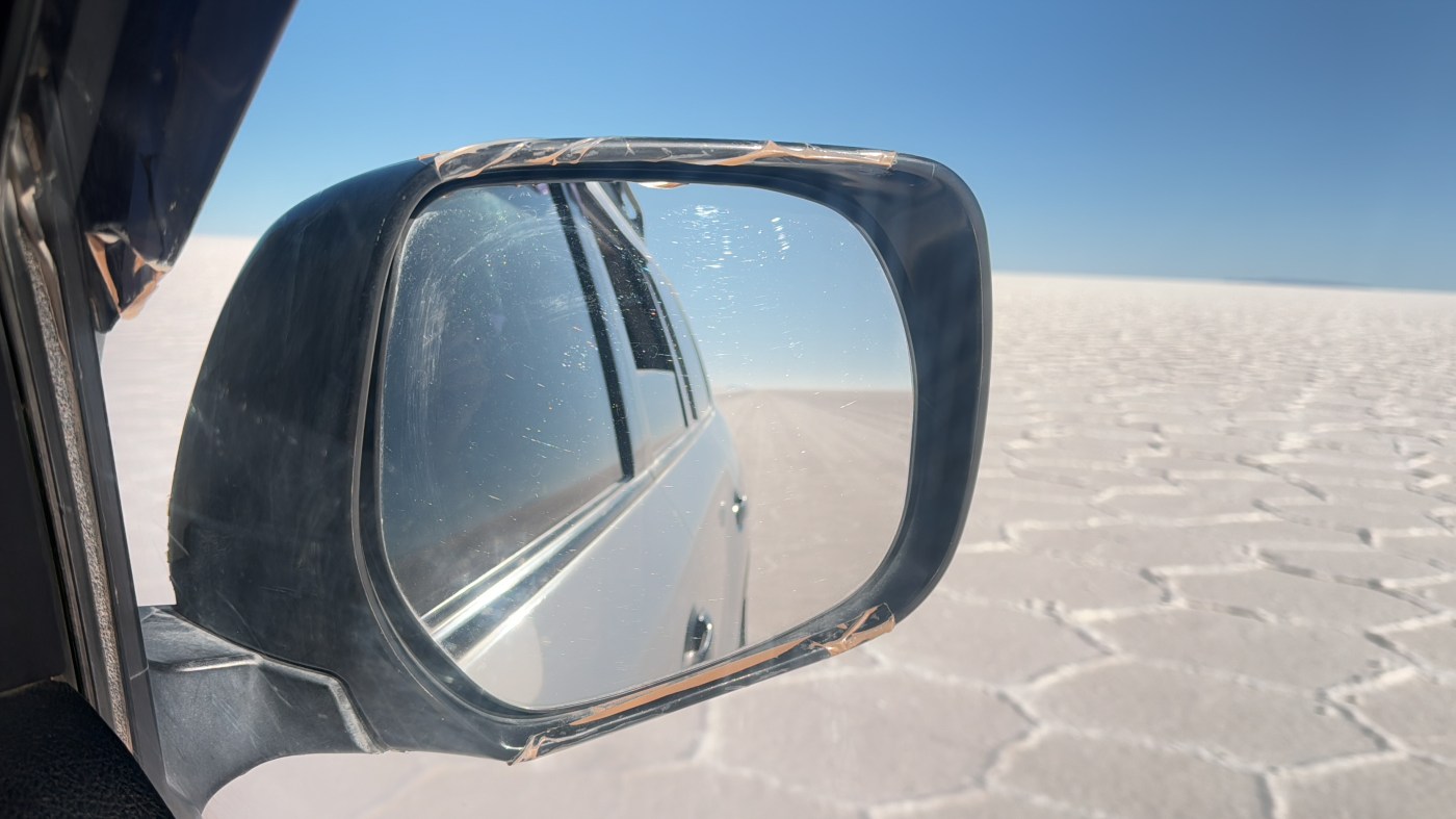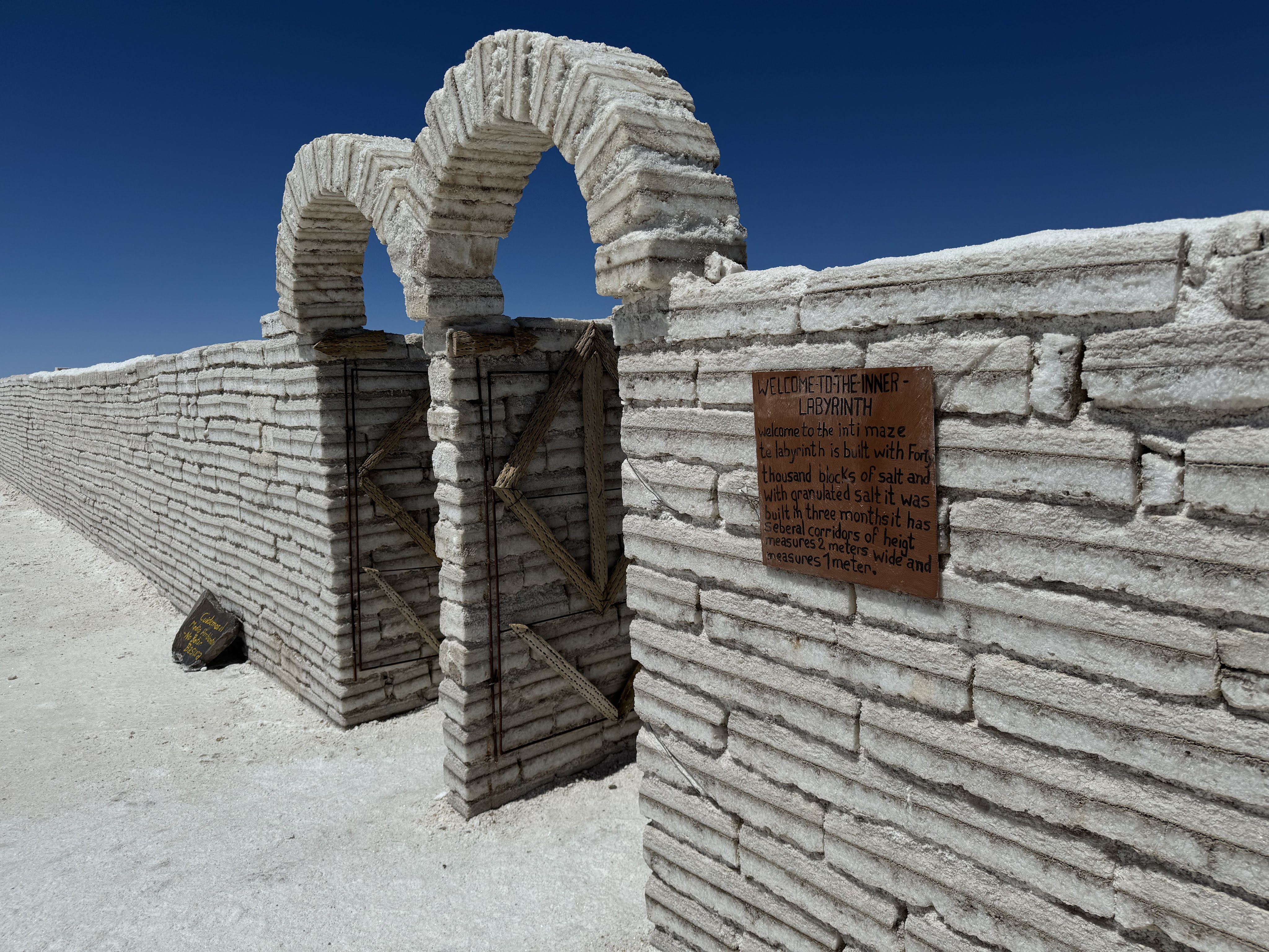 En als je denkt dat je nu toch wel het allermooiste van de reis hebt gezien, ga je de Salar de Uyuni op. Een enorme zoutvlakte (oppervlakte 12.500 km2) waarop we ons de hele dag vermaken. Je hebt het gevoel dat je over een grote sneeuwvlakte rijdt en verwacht elk moment dat de auto wegglijdt. Maar dat is natuurlijk niet zo. We verlaten ons “zouthotel” (zelfs de bedden zijn van zoutblokken gemaakt) en stoppen bij een doolhof, uiteraard ook van zout gemaakt. We vermaken ons er prima mee en ik moet zeggen dat het verdomd moeilijk is om de uitgang te vinden. Daarna is het tijd voor de creatievelingen. Op deze enorme kale vlakte kun je mooie foto’s maken door met perspectief te spelen. De mooiste creaties komen voorbij en voor we het weten is het alweer tijd voor het volgende verrassende natuurverschijnsel: cactuseiland. Hoewel grotendeels vlak zijn hier en daar wel eilanden aanwezig. Cactuseiland (Incahuasi) is de bekendste. Een klein eiland helemaal bezaaid met verschillende soorten cactussen, die mooi afsteken tegen een achtergrond van witte zoutvlakte en blauwe lucht. We maken een wandeling over het eiland waarbij flink geklauterd moet worden. De hoogte (hier ongeveer 3.600 meter) maakt het ons nog steeds lastig maar we raken er wel meer aan gewend. En vóór dit mooie tafereel wordt voor ons, midden op de zoutvlakte, een lunch geserveerd. By far de mooiste lunchplek die ik ooit heb gehad. Na een bezoek aan het eerste zouthotel dat nu als museum is ingericht is het alweer tijd voor een zonsondergang. Niet heel spectaculair moet ik zeggen maar toch wel mooi.