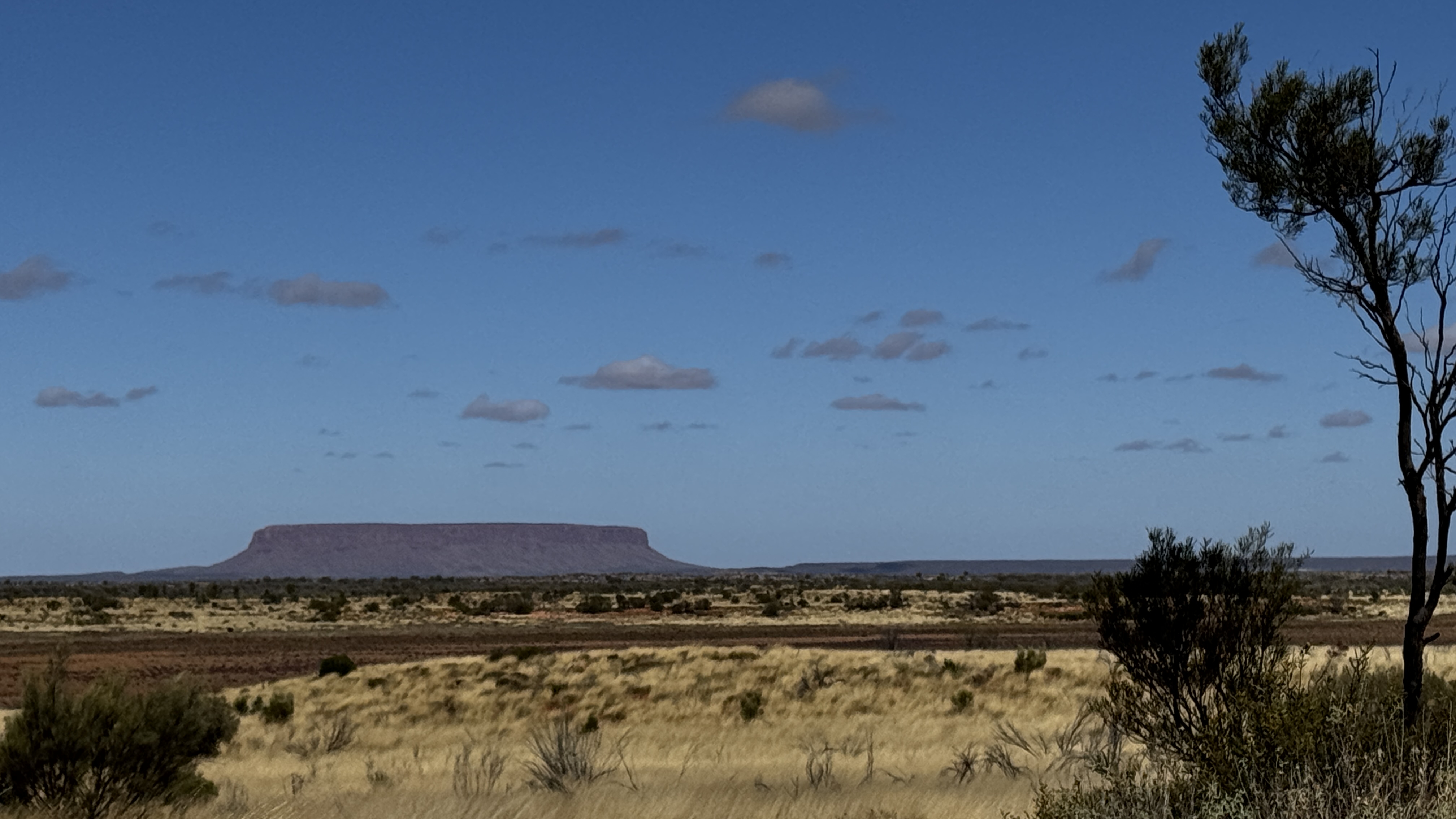 Op een camping is er al vroeg van alles gaande dus ik ben ook vroeg wakker. Dat geeft me mooi de tijd om op een heuvel naar de zonsopkomst te kijken. Ik heb helaas niet genoeg tijd om de hele transformatie in kleur van Uluru te zien maar zie toch wel dat een grote grijze klomp verandert in een prachtige berg. En zoals al eerder gemeld: ik ben in deze regio al meerdere keren geweest dus als we op onze weg naar de volgende bestemming bij een roadhouse stoppen (Curtin Springs mét zicht op Mount Connor) verwacht ik er verder niet veel van. Maar zie, één van de medereizigers kent de eigenaar en we worden uitgenodigd voor een kop koffie. En we mogen even meekijken met de zoon, die bezig is met school. En dat is hier “The school of the air”. Want als je overal een paar honderd kilometer vandaan woont kun je natuurlijk niet gewoon naar school. Dus zien we de juf en medeleerlingen op een computerscherm ijverig werkend aan een rekenles. Voor de rest rijden we de hele dag, eerst asfalt maar later op de Larapinta Drive over gravel. En aangezien het hier ook geregend heeft, schiet het niet echt op, want de weg is behoorlijk modderig en glibberig. Eindelijk, pas tegen half acht, komen we op de campsite aan. We moeten onze tent in het donker opzetten en eten pas om 9.00 uur.