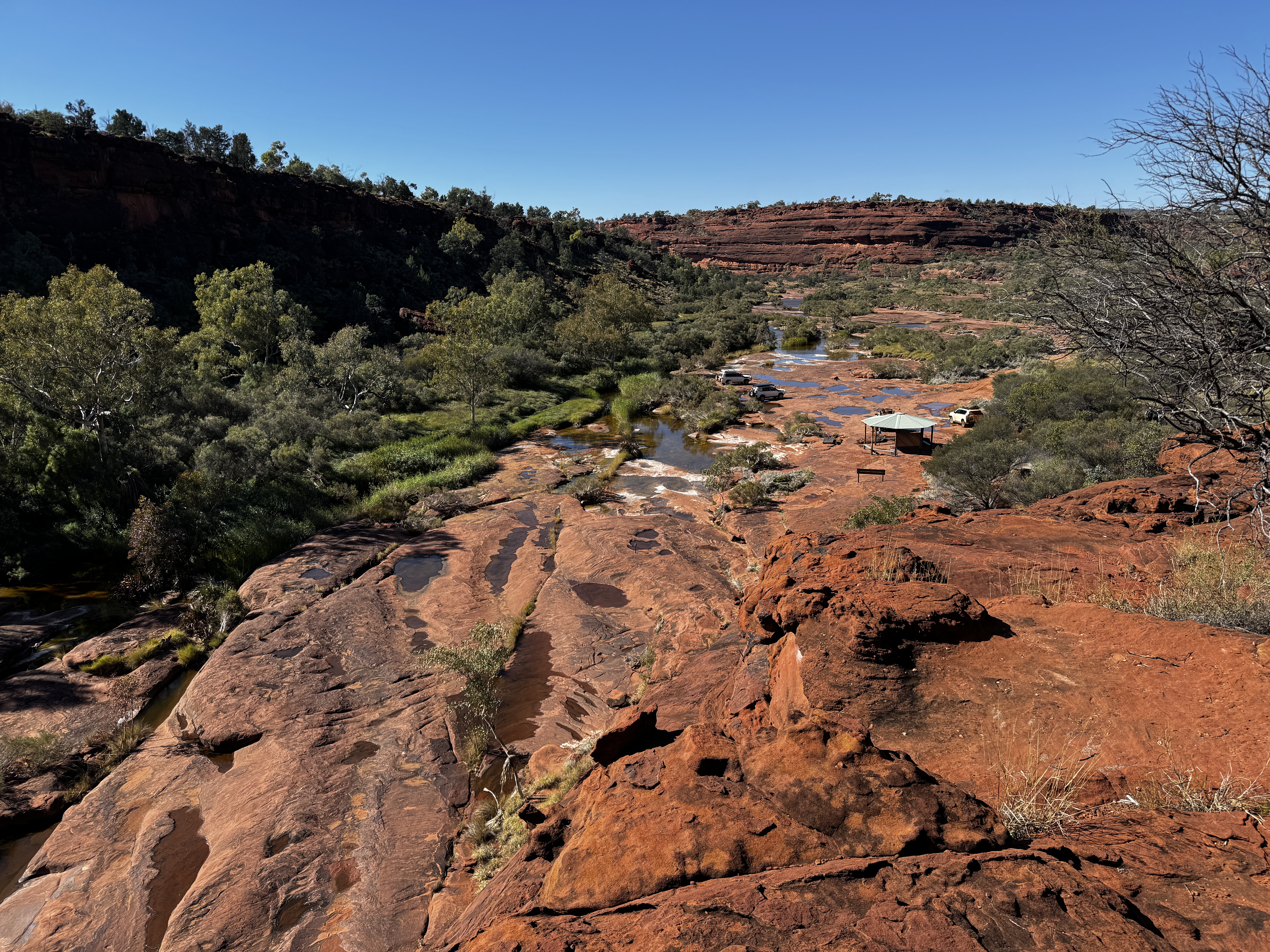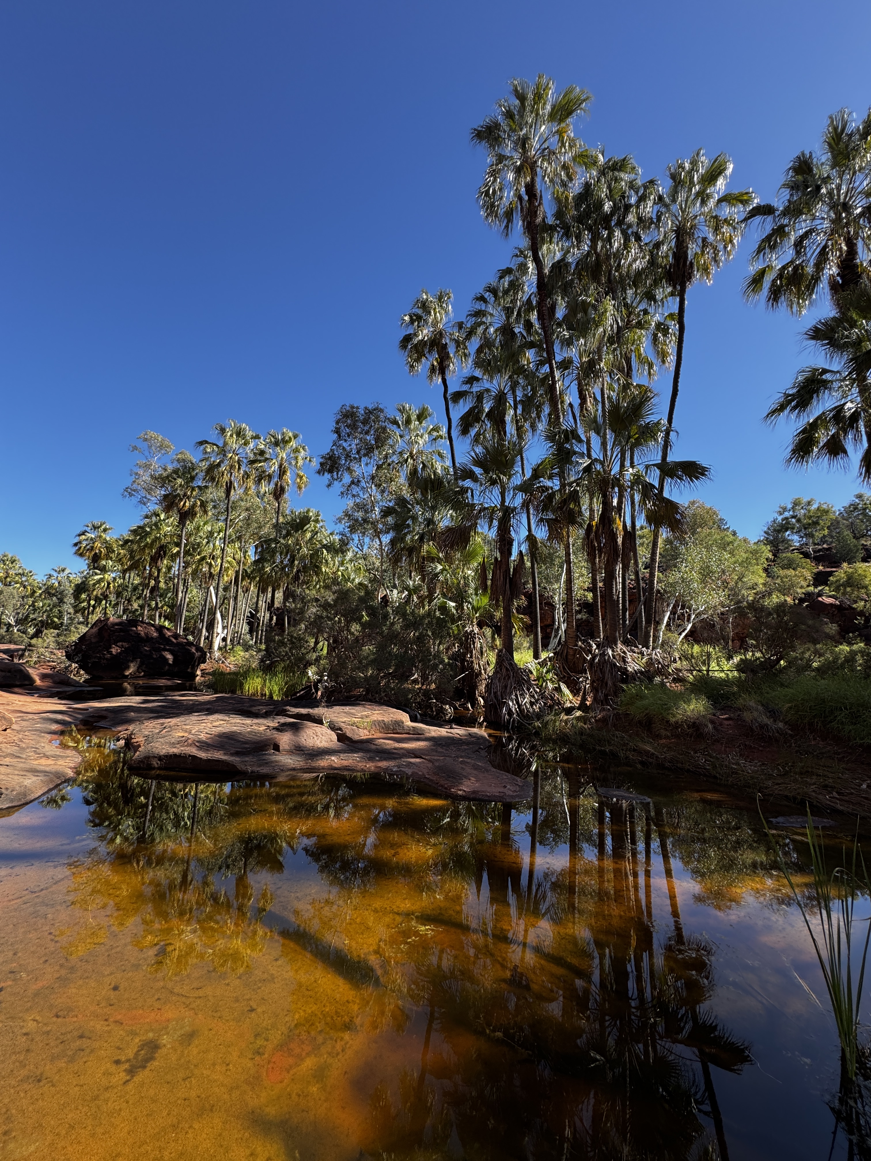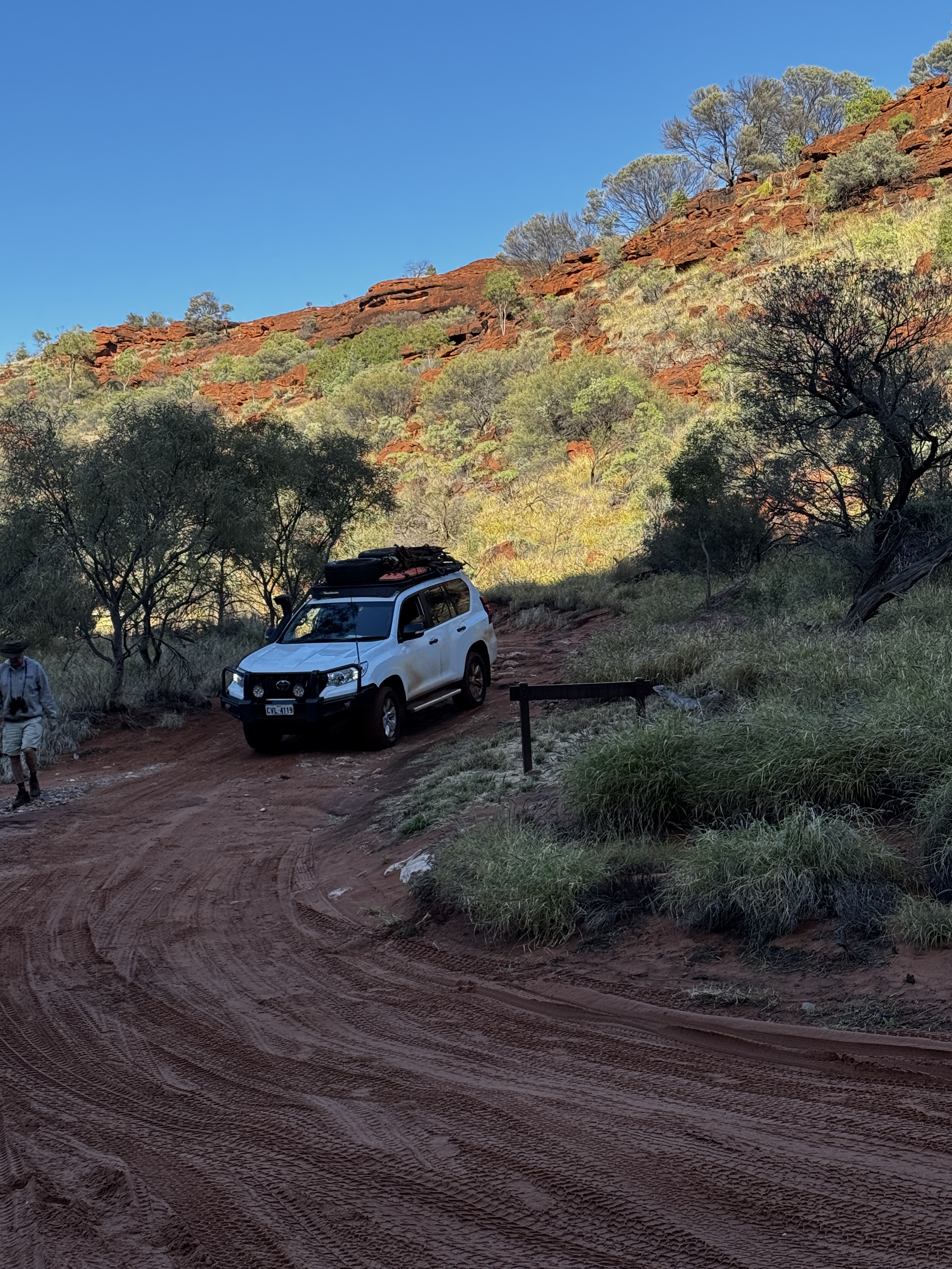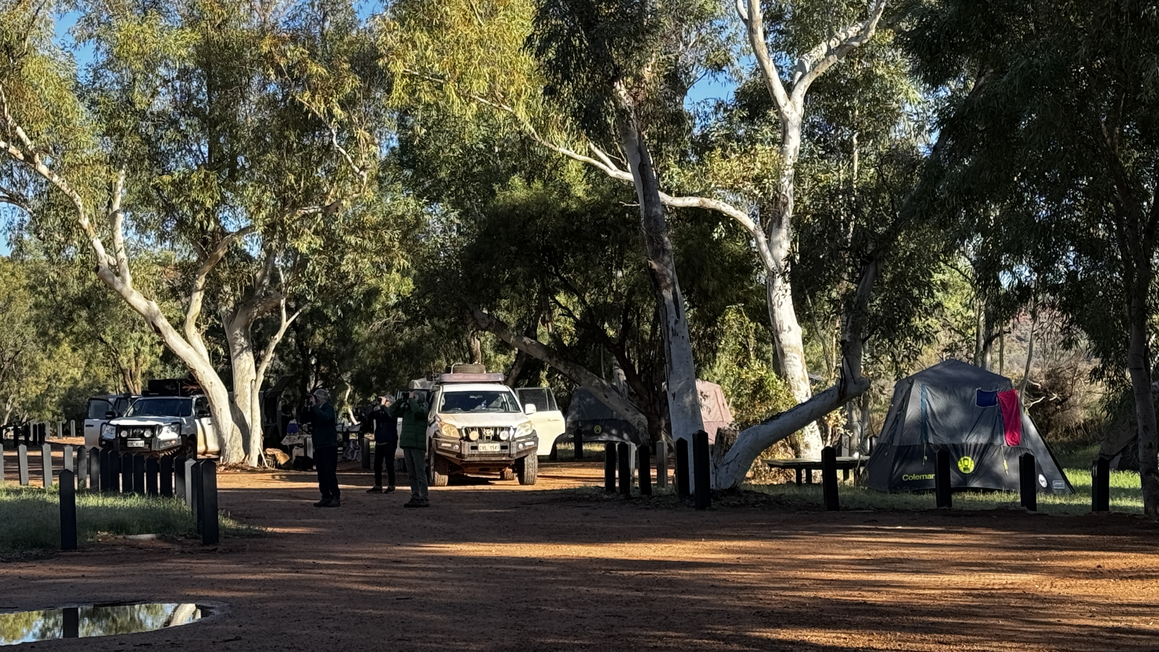 Als ik opsta ben ik verrast door het zicht op de Finke River. De zon schijnt maar er komt mist over het water, prachtig! Na het ontbijt maken we onze lunch klaar want we gaan wandelen in Palm Valley. De track de vallei in en naar het begin van de wandeling die we gaan maken is maar zo’n 4 km. Maar we besluiten al snel dat we ook dit stuk gaan lopen. Je ziet meer als je buiten bent én we kunnen de capriolen van de auto gadeslaan als deze door en over moeilijke stukken gaat. Lopen gaat net zo snel als met auto. De wandeling is prachtig en we zijn zo’n 4 uur heerlijk onderweg. Bij een lastig stukje valt helaas wel iemand in het water maar hij kan er gelukkig zelf wel om lachen. Op de terugweg naar de campsite blijven we wel zitten, want moe. Hoe lastig het terrein is blijkt wel want onze ervaren chauffeur komt toch vast te zitten. Zeer voldaan gaan we de laatste nacht in. Aan de ene kant heb ik natuurlijk een beetje weemoedige gevoelens daarbij, deze reis is/was geweldig! Aan de andere kant is het toch ook wel een lekker idee om morgen weer in een hotelkamer/-bed te slapen. Zeker omdat het hier verrekte koud was vannacht en het dat de komende nacht ook wel zal zijn.