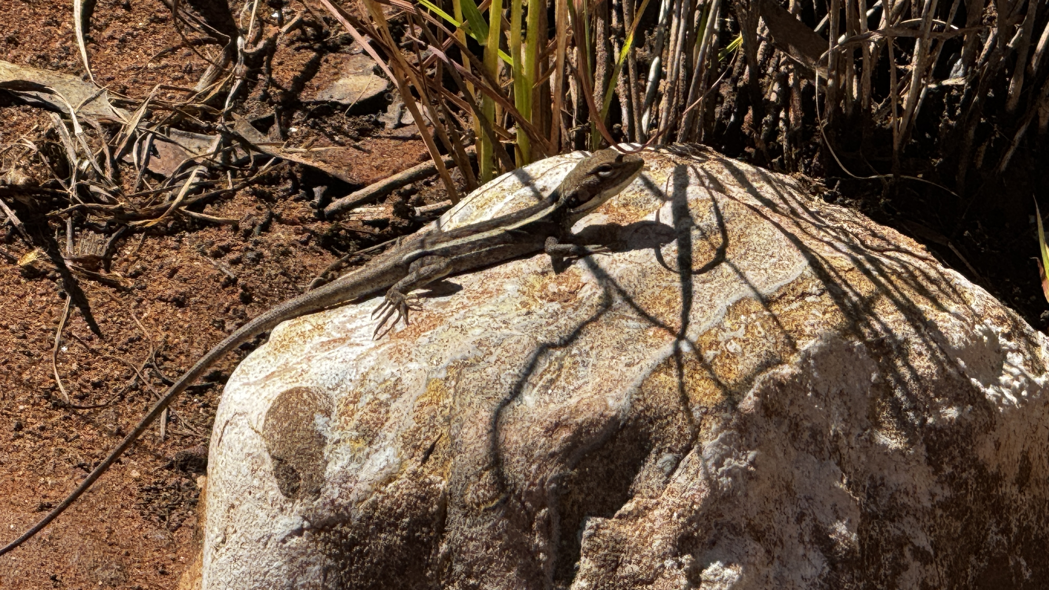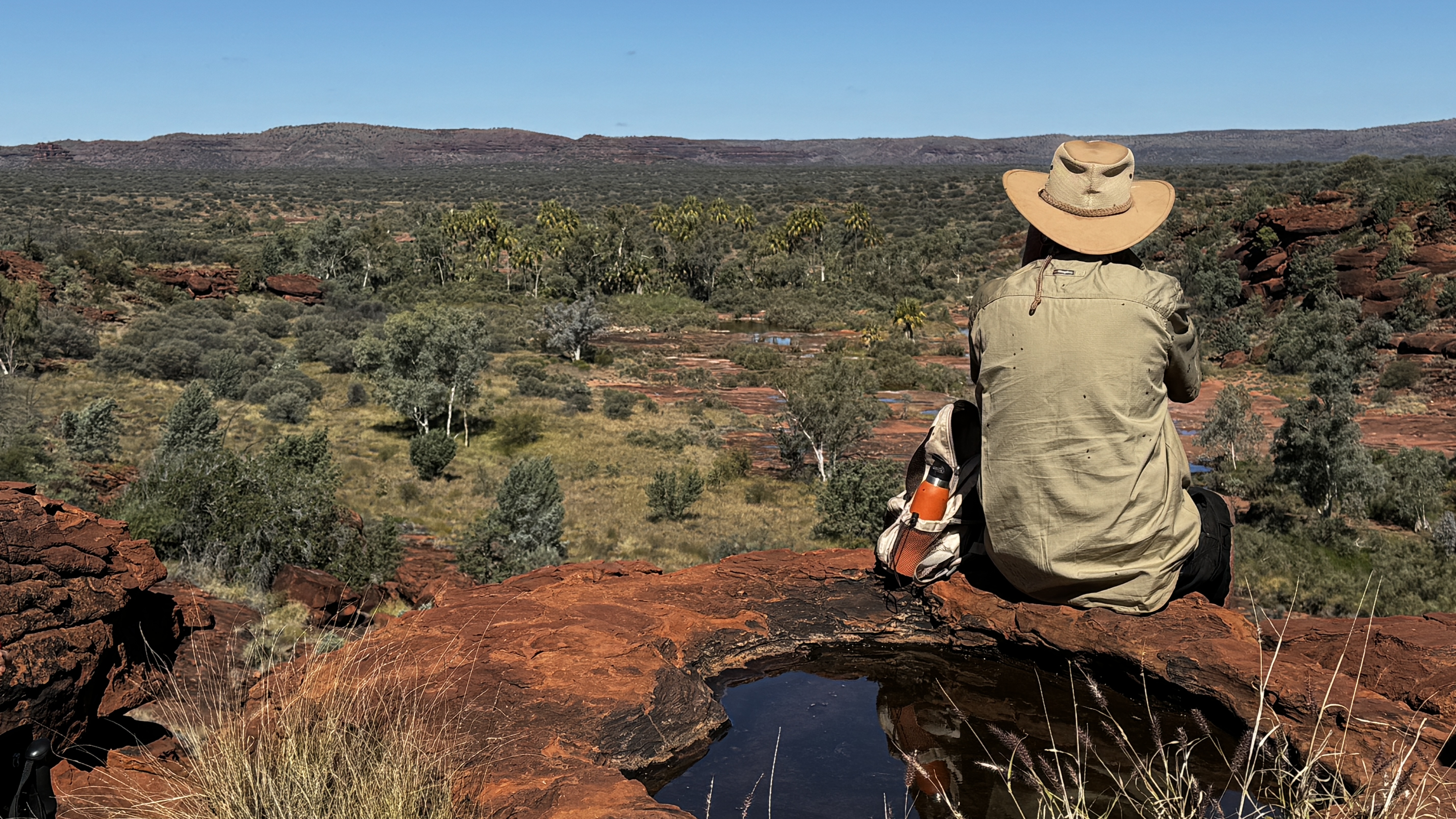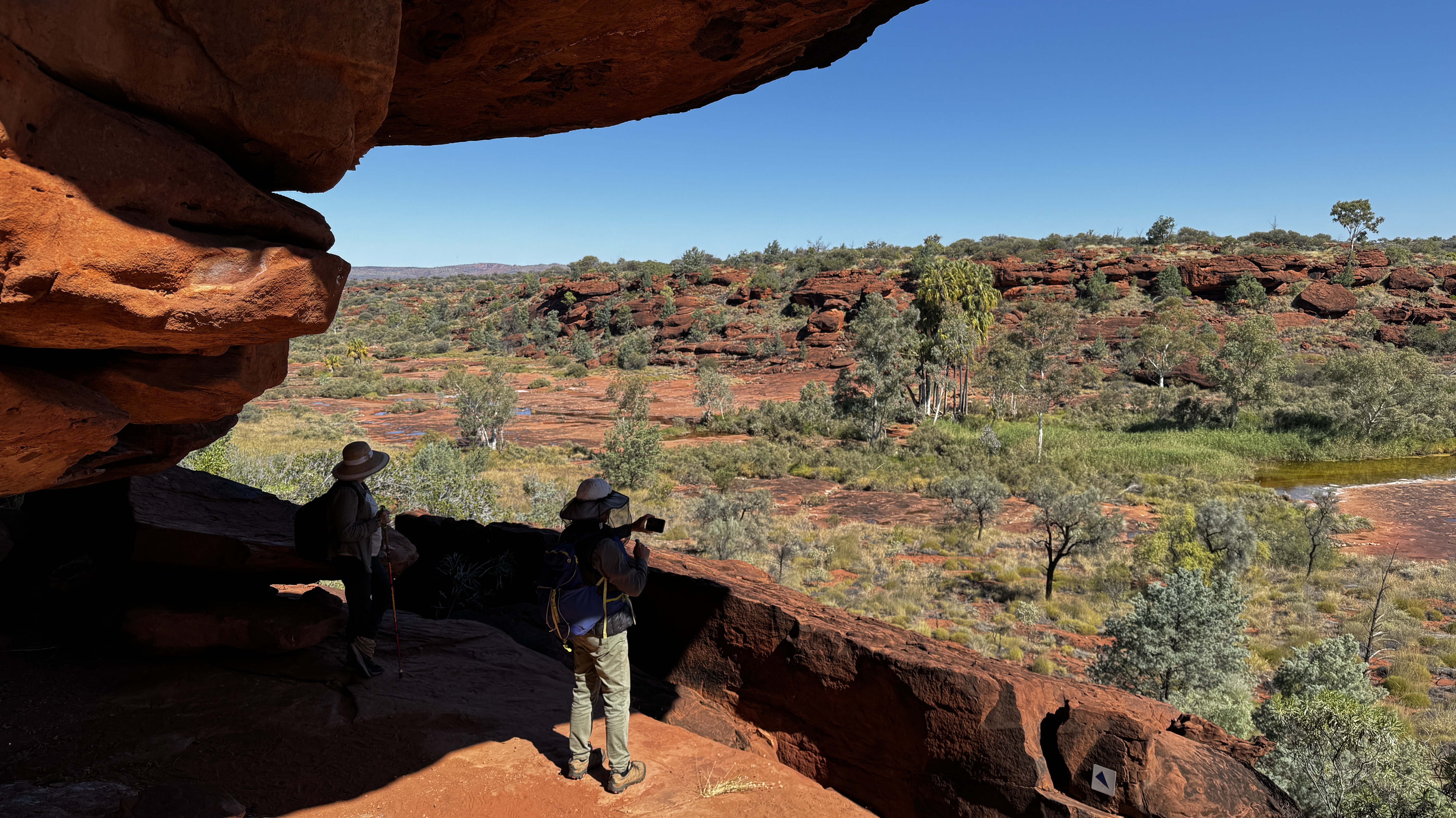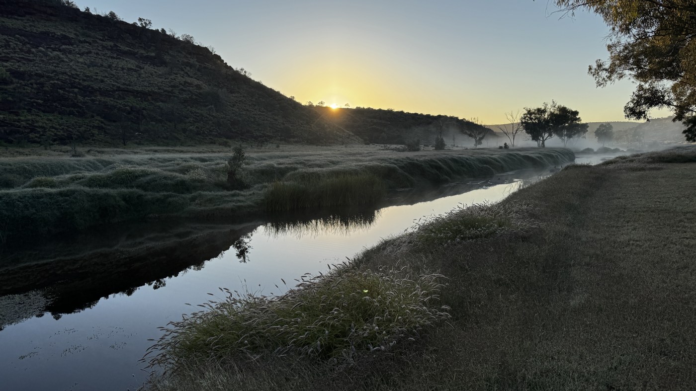 Als ik opsta ben ik verrast door het zicht op de Finke River. De zon schijnt maar er komt mist over het water, prachtig! Na het ontbijt maken we onze lunch klaar want we gaan wandelen in Palm Valley. De track de vallei in en naar het begin van de wandeling die we gaan maken is maar zo’n 4 km. Maar we besluiten al snel dat we ook dit stuk gaan lopen. Je ziet meer als je buiten bent én we kunnen de capriolen van de auto gadeslaan als deze door en over moeilijke stukken gaat. Lopen gaat net zo snel als met auto. De wandeling is prachtig en we zijn zo’n 4 uur heerlijk onderweg. Bij een lastig stukje valt helaas wel iemand in het water maar hij kan er gelukkig zelf wel om lachen. Op de terugweg naar de campsite blijven we wel zitten, want moe. Hoe lastig het terrein is blijkt wel want onze ervaren chauffeur komt toch vast te zitten. Zeer voldaan gaan we de laatste nacht in. Aan de ene kant heb ik natuurlijk een beetje weemoedige gevoelens daarbij, deze reis is/was geweldig! Aan de andere kant is het toch ook wel een lekker idee om morgen weer in een hotelkamer/-bed te slapen. Zeker omdat het hier verrekte koud was vannacht en het dat de komende nacht ook wel zal zijn.