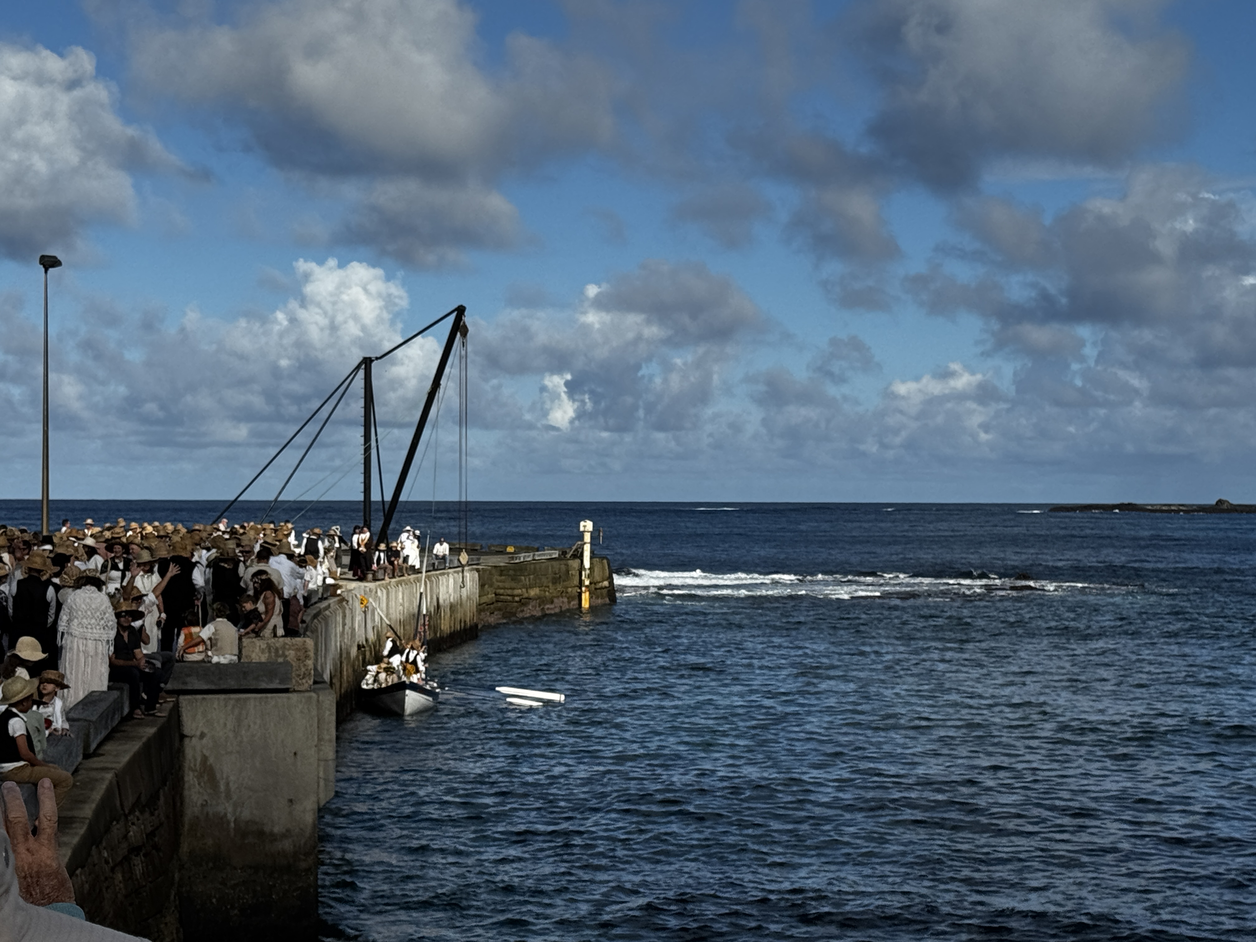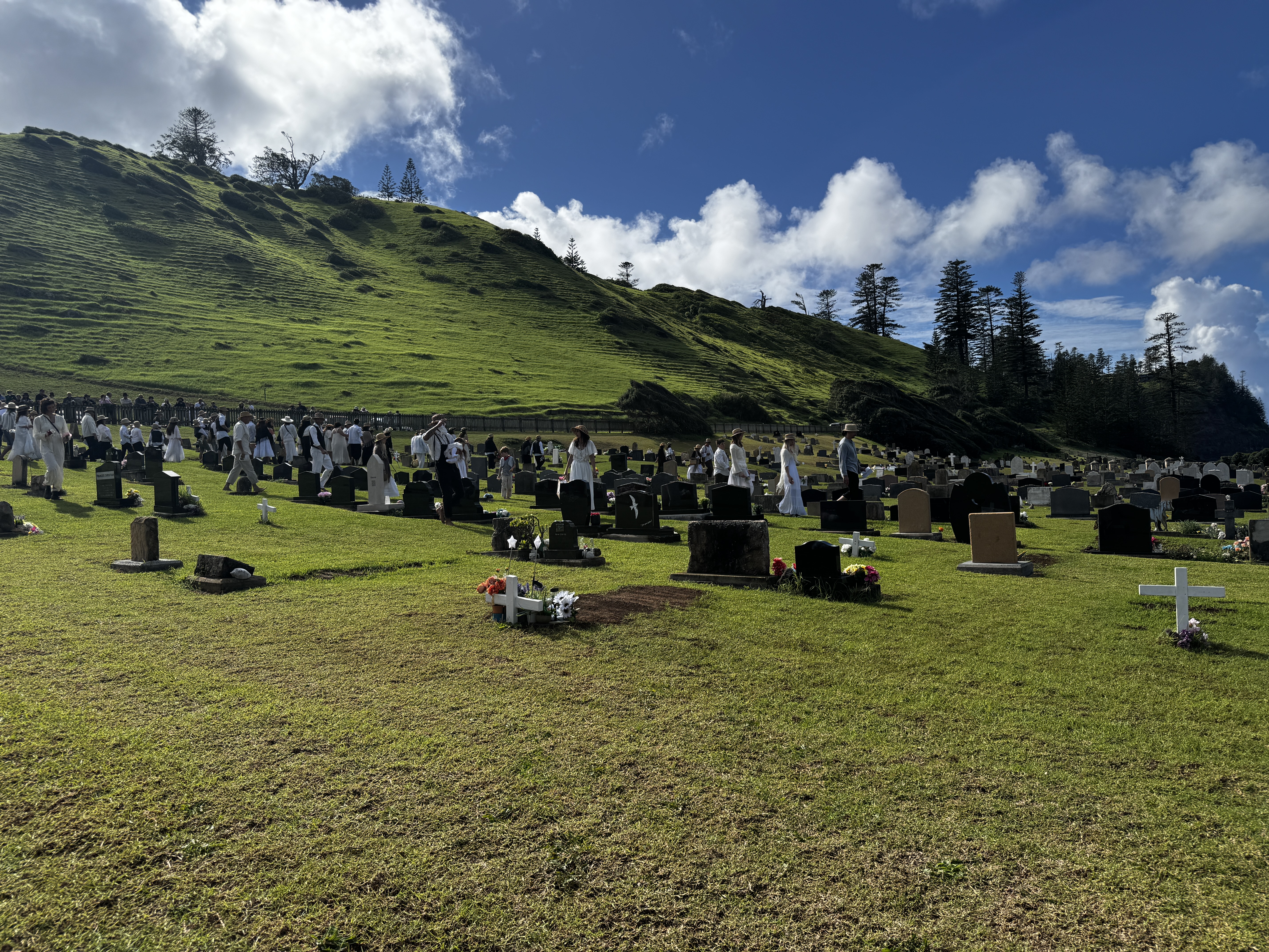Vandaag is de grote dag: Bounty Day. We gaan naar de Kingston Pier. Dit is de plek waar de Pitcairners op 8 juni 1856 aan land kwamen. Deze dag wordt elk jaar gevierd maar omdat het dit jaar op een zondag valt, is het deze keer op 9 juni. De dorpelingen staan klaar, gekleed naar de mode van 1856, op de pier om de aankomst van de boot te bekijken. Er wordt een aantal mensen in een sloep het water in gelaten en na een paar rondjes varen komt deze weer aan wal als symbool van de aankomst in 1856. In een optocht lopen we (want niet-eilanders mogen aansluiten) naar het monument voor de gevallenen uit de 1e en 2e wereldoorlog waar kransen worden gelegd en “God save the king” (Charles is nog steeds hun koning) wordt gezongen. Vervolgens gaat het naar het kerkhof waar wordt stilgestaan bij deze dag. Hier wordt het volkslied van Pitcairn/Norfolk Island “Come ye blessed” gezongen. En ze zingen mijn favoriet “In The Sweet By and By”. Dit laatste is het lied dat op Pitcairn werd gezongen toen wij daar waren.