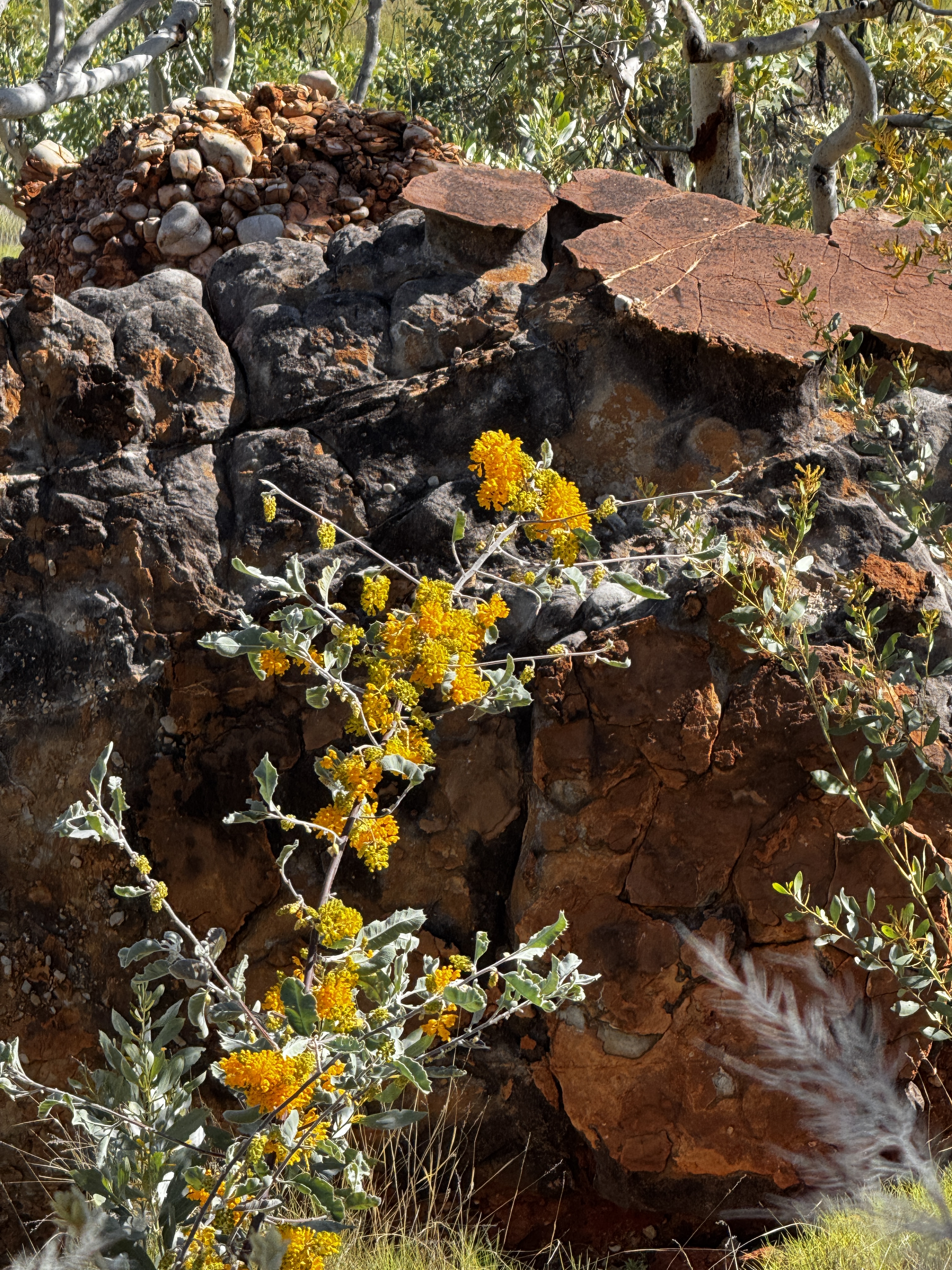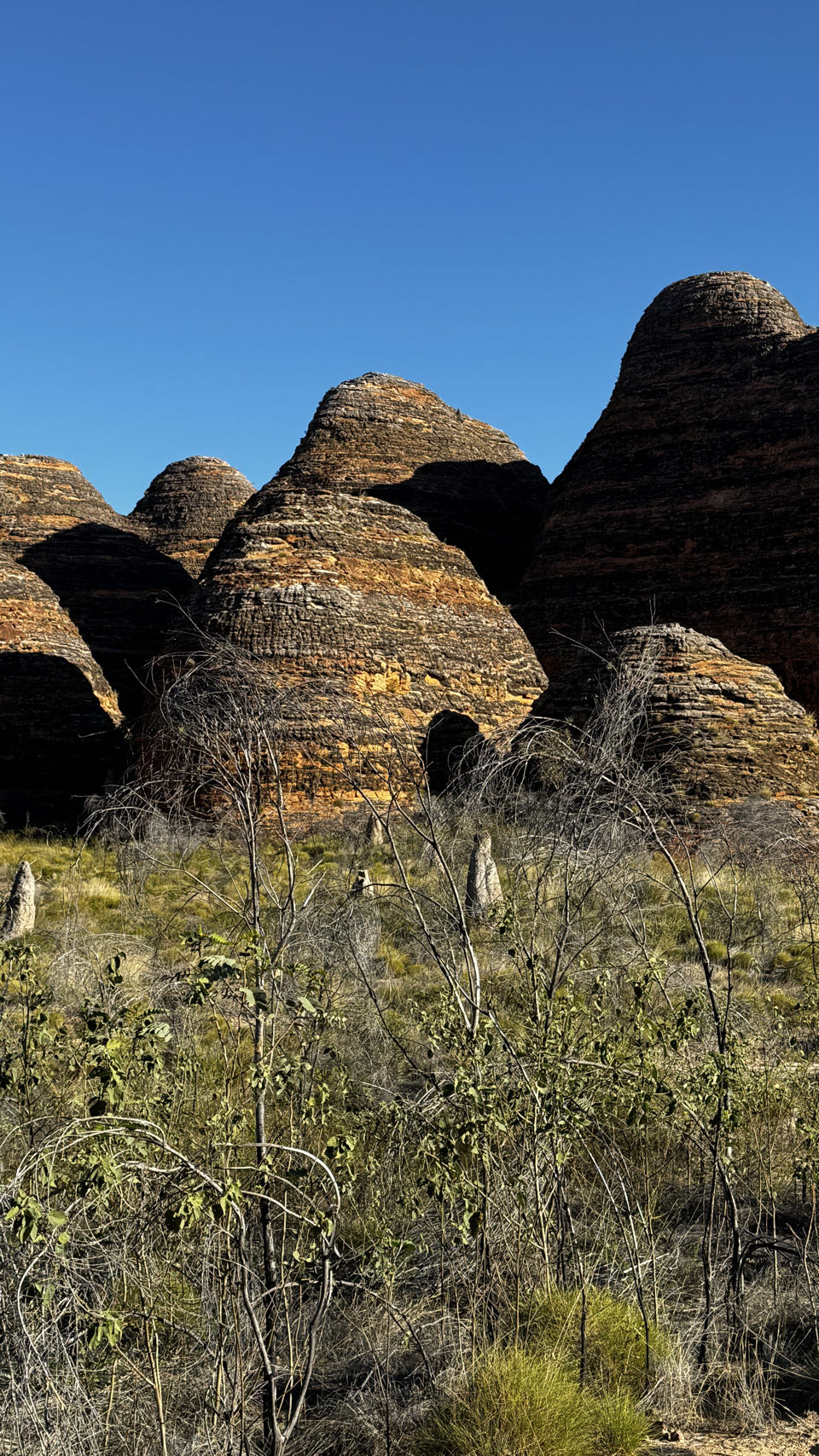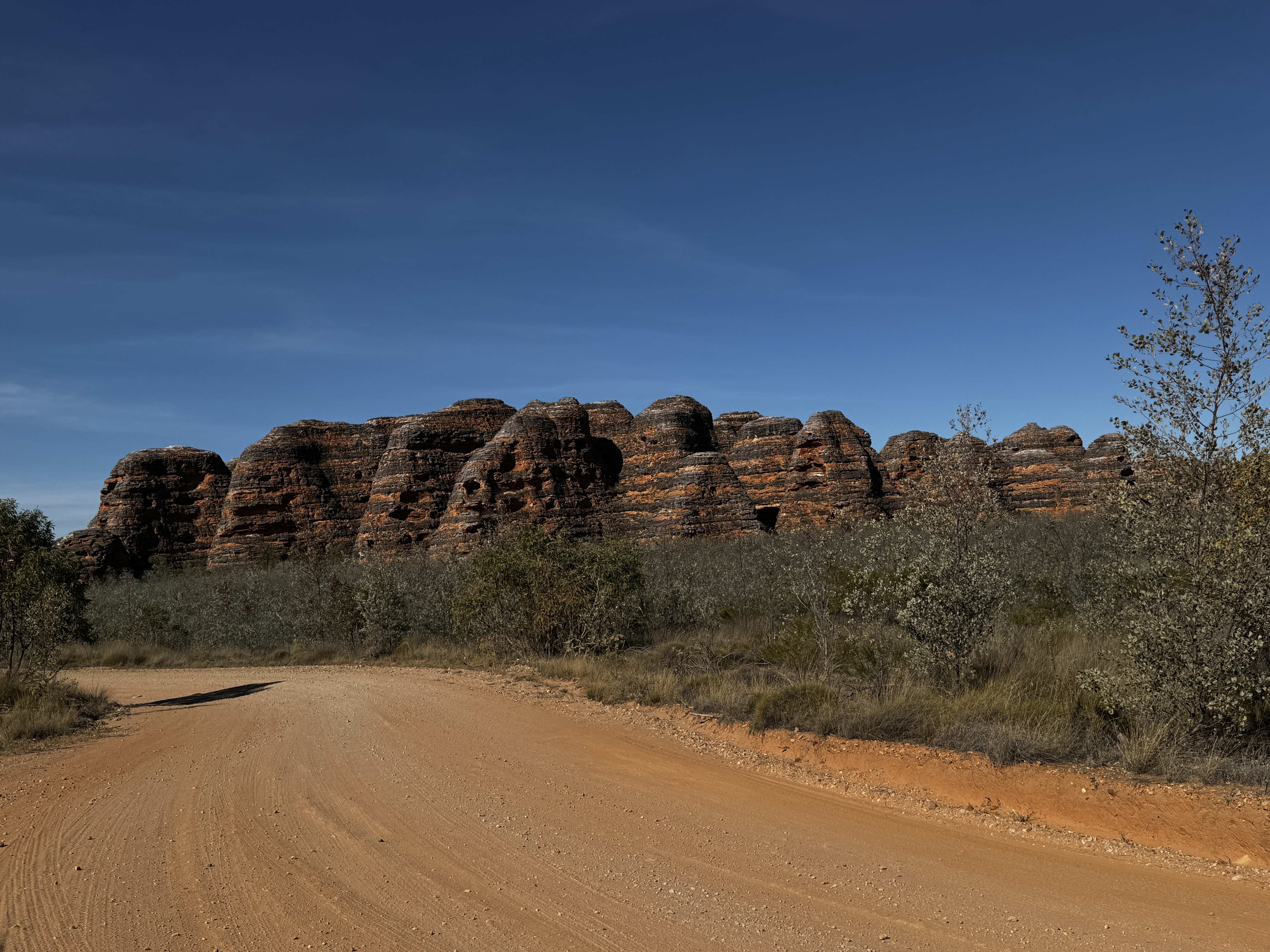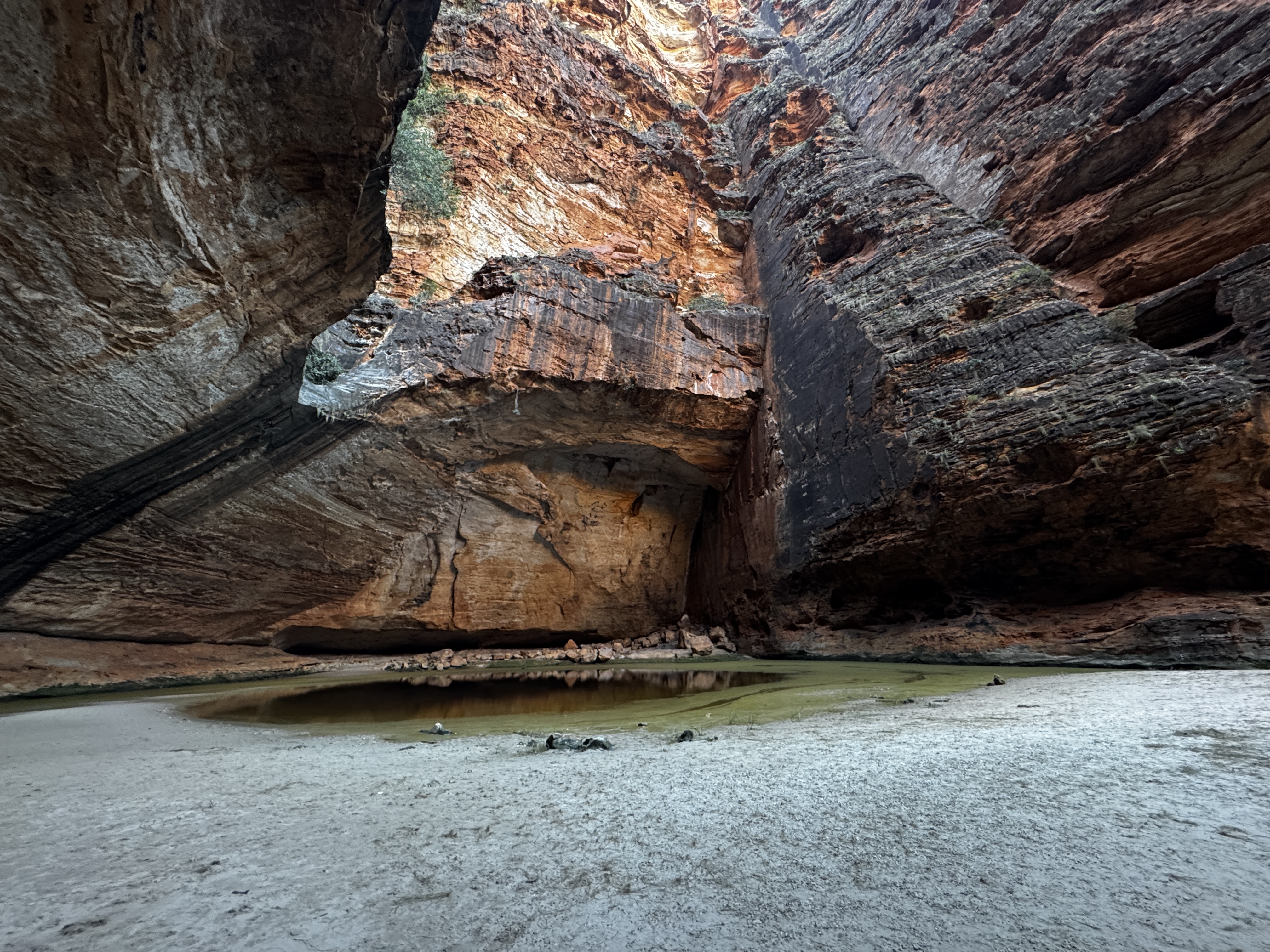 We hebben 1 dag om de highlights in het park te bekijken. Dat is natuurlijk veel te weinig want er is heel veel te zien en er is een groot aantal wandelingen te maken. Maar onze tijd is nou eenmaal beperkt en het rijden naar de verschillende punten vraagt ook de nodige tijd dus houden we het op de 2 grootste trekpleisters: Echidna Chasm en Cathedral Gorge. En we zien de omgeving vanaf een aantal lookouts. Echidna Chasm is prachtig, hier en daar heel smal en het zonlicht maakt het plaatje nog mooier. Jammer dat dit niet goed op de foto’s vast te leggen is. Ook de kathedraal ligt er mooi bij. Het wordt ook wel het amphitheater genoemd vanwege de akoestiek. En we hebben geluk, we zijn op dat moment de enige twee personen op deze plek. Al met al een mooie dag met mooie wandelingen en schitterende, zeer gevarieerde landschappen. We liggen wel vroeg in onze comfortabele tent want we hebben morgen een lange reisdag naar Fitzroy Crossing voor de boeg.