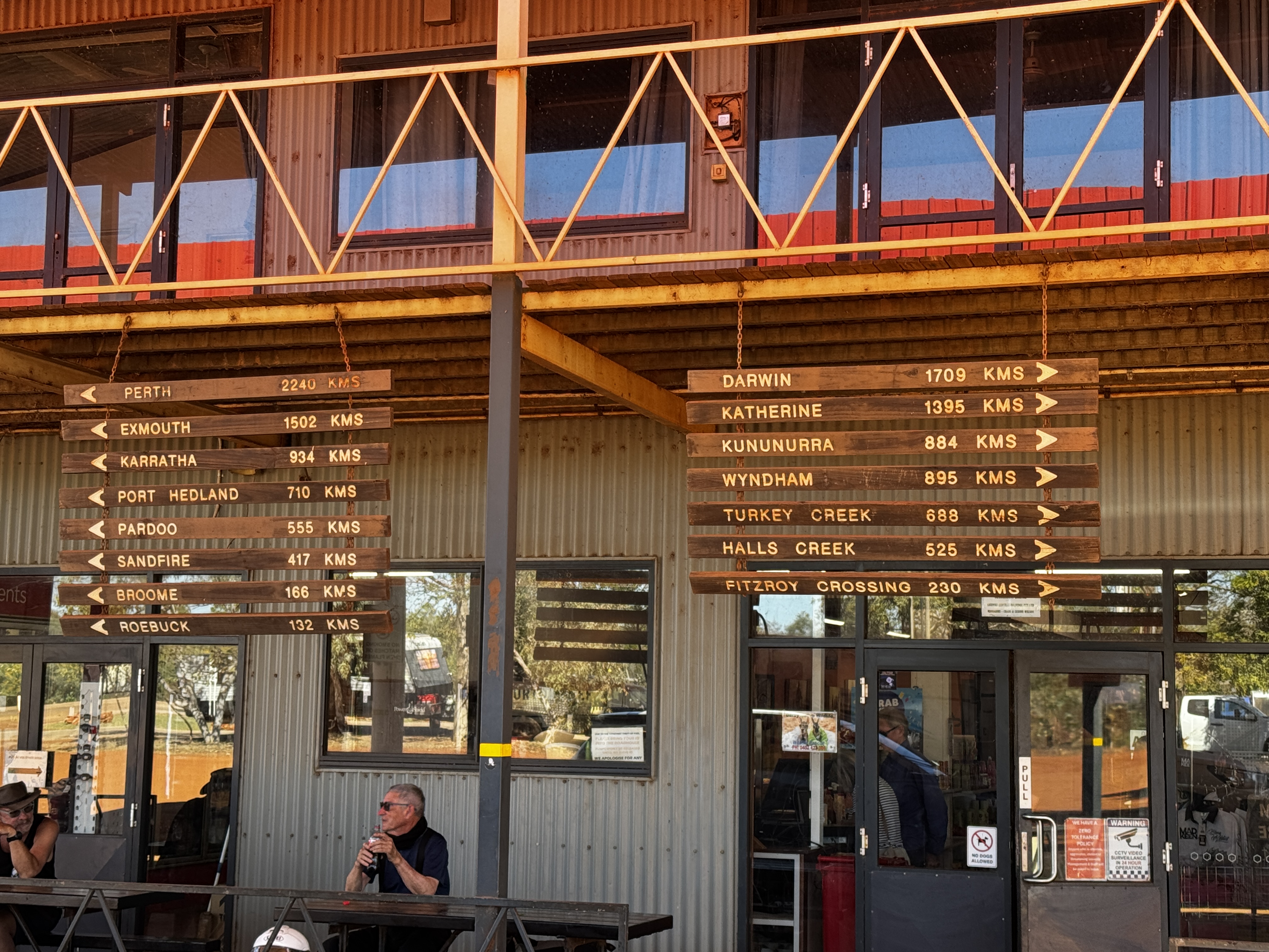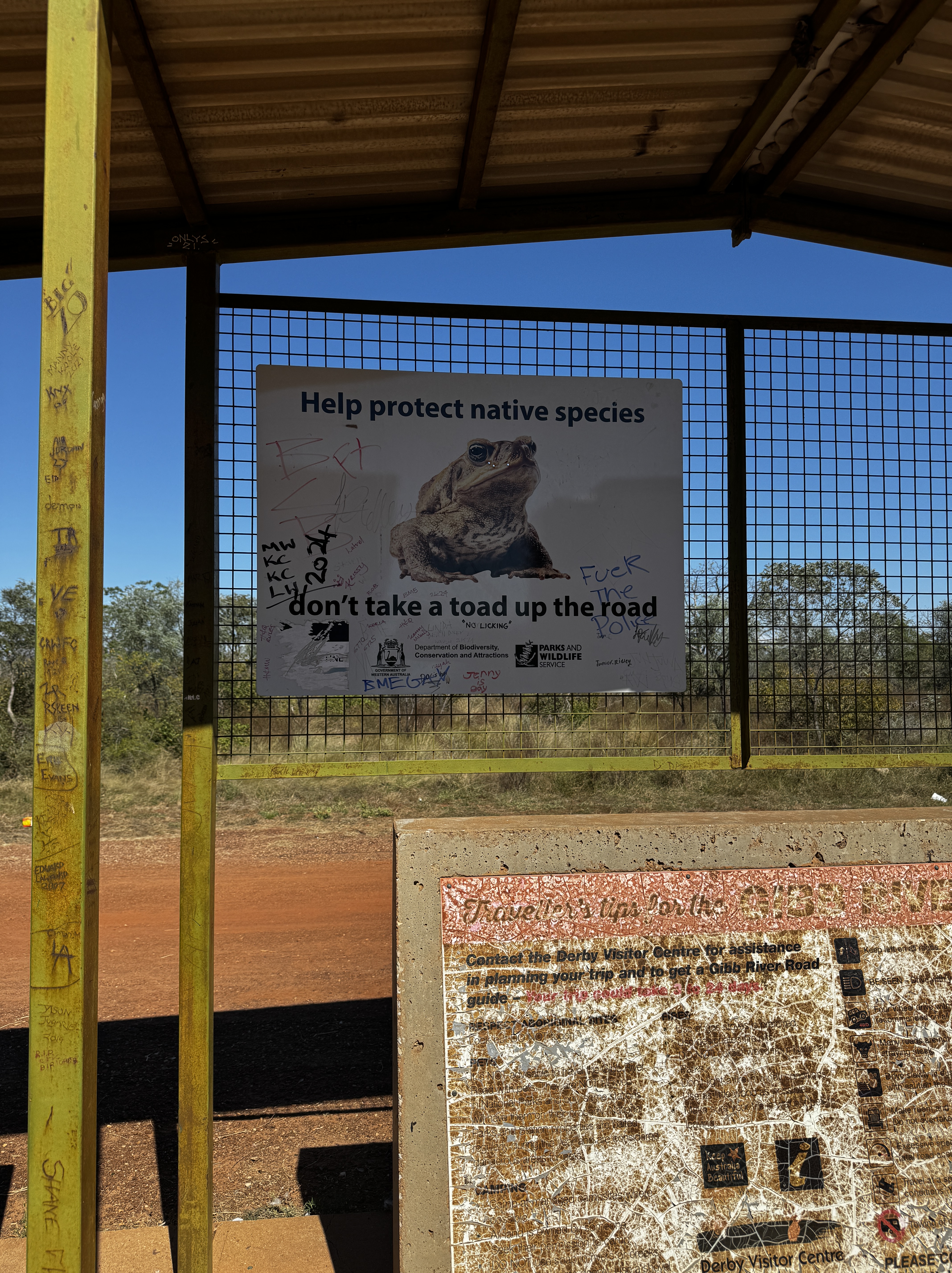 We hebben besloten om geen uitstapjes meer te doen op weg naar Broome. Dus laten we eventuele wandelingen in Geikie of Windjana Gorge en Tunnel Creek links liggen. Voor mij niet zo’n punt want die heb ik in 2003 al gezien. Voor koffie en ontbijt/lunch gaan we naar het “winkelcentrum” in Fitzroy Crossing. Dit is alleen de IGA (supermarkt) met nog een takeaway en een postkantoor. Voor de koffie gaan we naar de Shell. Het valt ons ook hier weer op dat alles behoorlijk beveiligd is met ijzeren hekken en dik glas. Het lijkt me toch niet echt prettig om hier te moeten werken. Van Fitzroy Crossing naar Broome is het 400km. Onderweg zijn er, buiten de al genoemde gorges etc. geen noemenswaardige plekken te bewonderen. Alleen een hele mooie boab😁. En ook hier zien we weer waarschuwingen over het ongewild verspreiden van cane toads. Deze padden vormen een plaag in heel noordelijk Australië. Ze zijn giftig voor veel dieren en diverse soorten zijn daardoor al met uitsterven bedreigd. Opnieuw een voorbeeld van een geïntroduceerd dier dat problemen veroorzaakt. En het wrange is dat ze zijn uitgezet om kevertjes in het suikerriet te verdelgen maar dat hebben ze nooit gedaan, daarvoor worden nu pesticiden gebruikt. Broome is nog steeds een klein stadje maar wel nog wel levend zoals ik dat maar even noem. Er heerst een hele andere sfeer dan de dorpen en steden waar we tot nu toe doorheen zijn gekomen.